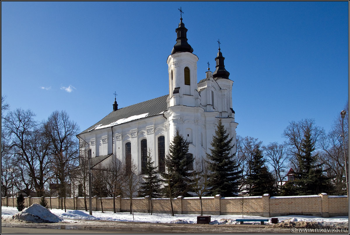 У інтэр’еры высокі неф (14,1 м) перакрыты цыліндрычным скляпеннем на падружных арках з люнетамі (фрэскавы роспіс не захаваўся). Прэсбітэрый аддзелены ад яго бакавымі ляпнымі алтарамі і парталам. Да алтарнай часткі прымыкаюць бакавыя квадратныя ў плане сакрысціі. Прастора інтэр’ера асвятляецца высокімі арачнымі аконнымі праёмамі. У паўночнай частцы храма на трох арках з гранёнымі бочкападобнымі апорамі і крыжовых скляпеннях умацаваны хоры, кулісы якіх маюць ілюзорны перспектыўны роспіс у тэхніцы грызайль.