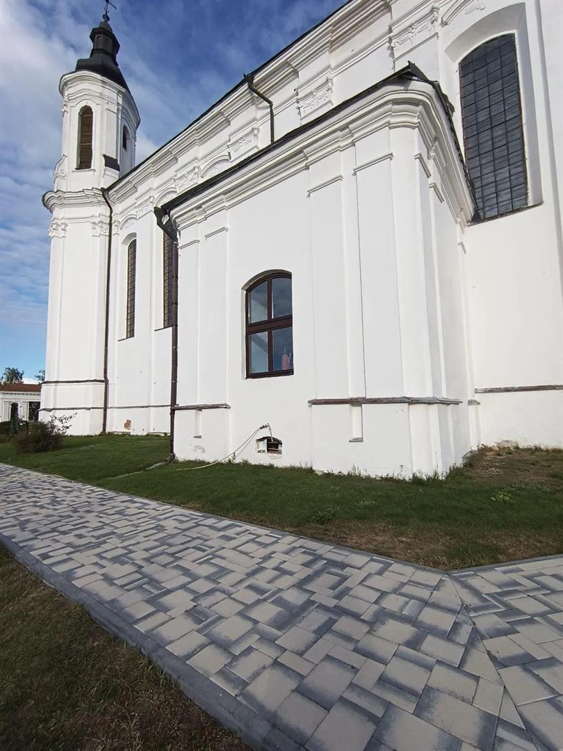 Касцёл – мураваны, аднанефны, прамавугольны храм, накрыты тросхільным дахам. У яго кампазіцыі пануюць дзве ярусныя вежы з фігурнымі шатрамі і высокім фігурным шчытом, які плаўна пераходзіць каля асновы ў бакавыя валюты.