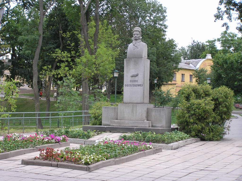 Помнік Элізе Ажэшцы - скульптурны партрэт Э. Ажэшкі працы Р. Зерыха і архітэктара В. Куявінскага. Выраблены з шэрага паліраванага граніту. Усталяваны на складаным па форме пастаменце. З дэтальнай дакладнасцю перададзены рысы твару пісьменніцы ў сталыя гады яе жыцця: выразна акрэслены падбародак, лёгкая ўсмешка, зморшчанкі каля вачэй. Высокая прычоска, пышна павязаны шаль надаюць вобразу пісьменніцы рамантычнае адценне.