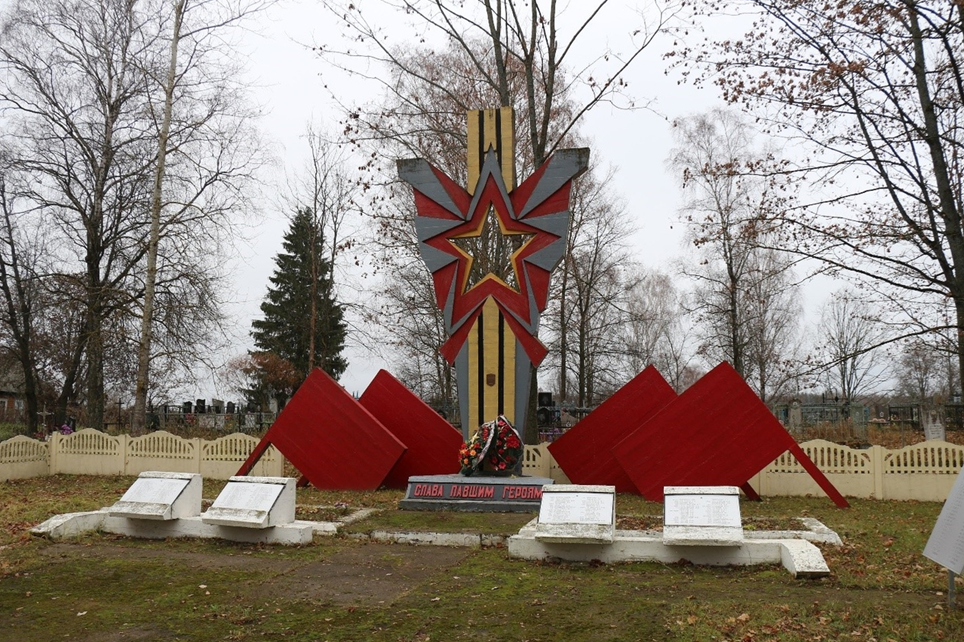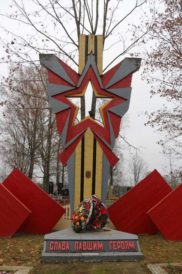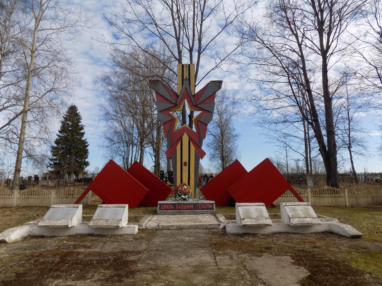 У 1968 г. на магіле пастаўлены абеліск. У 1992 г. пастаўлена мемарыяльная кампазіцыя: бетонная стэла з фігурнай зоркай і сімвалічнымі промнямі, якія разыходзяцца ад яе. У 2015 г. усталяваны пліты з удакладненымі імёнамі пахаваных.