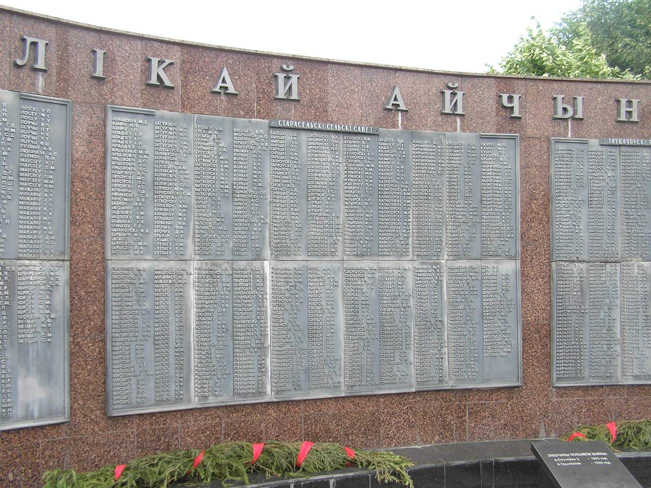 У 1954 г. на магіле пастаўлены помнік -- скульптура воіна на фоне абеліска. На памятных надмагільных плітах пералічаны імёны загінуўшых. З паўднёвага і заходняга бакоў брацкую магілу акружае мемарыяльная сцяна, на якой спісы загінуўшых землякоў па сельсаветах раёна. Дапаўняюць сцяну памяці мемарыяльныя пліты знішчаным вёскам.