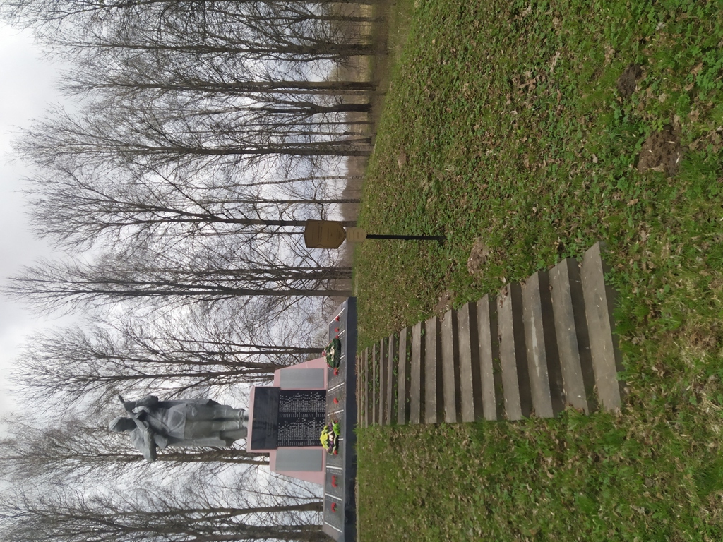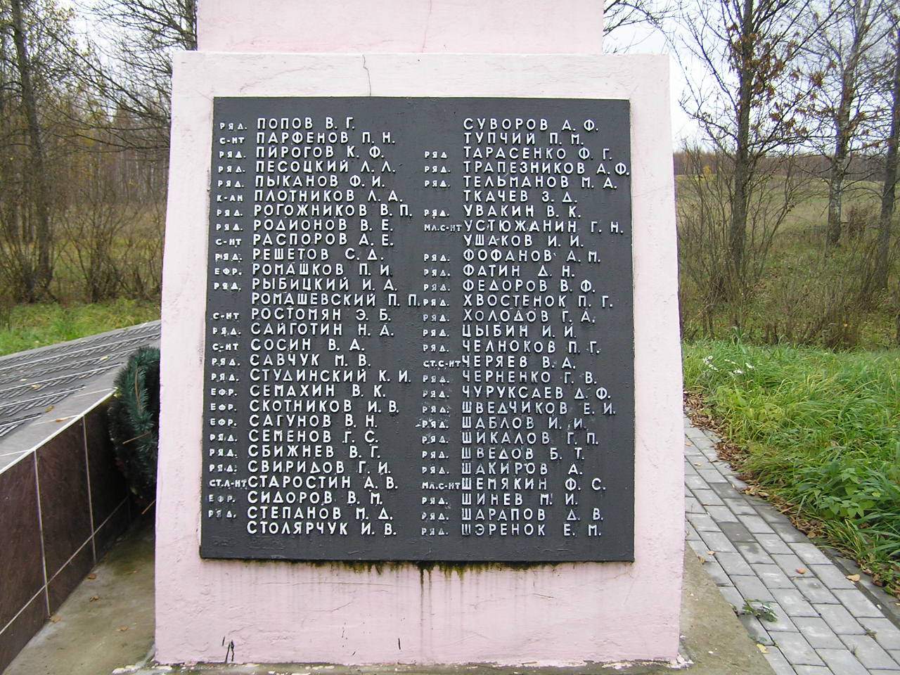 У 1969 г. на магіле пастаўлены помнік – на высокім пастаменце скульптура воіна з аўтаматам. Перад пастаментам размешчана надмагільная пліта з пералікам імён пахаваных. Мемарыяльныя дошкі з імёнамі таксама замацаваны на пастаменце. Тэрыторыя вакол брацкай магілы добраўпарадкавана, абсаджана дрэвамі.