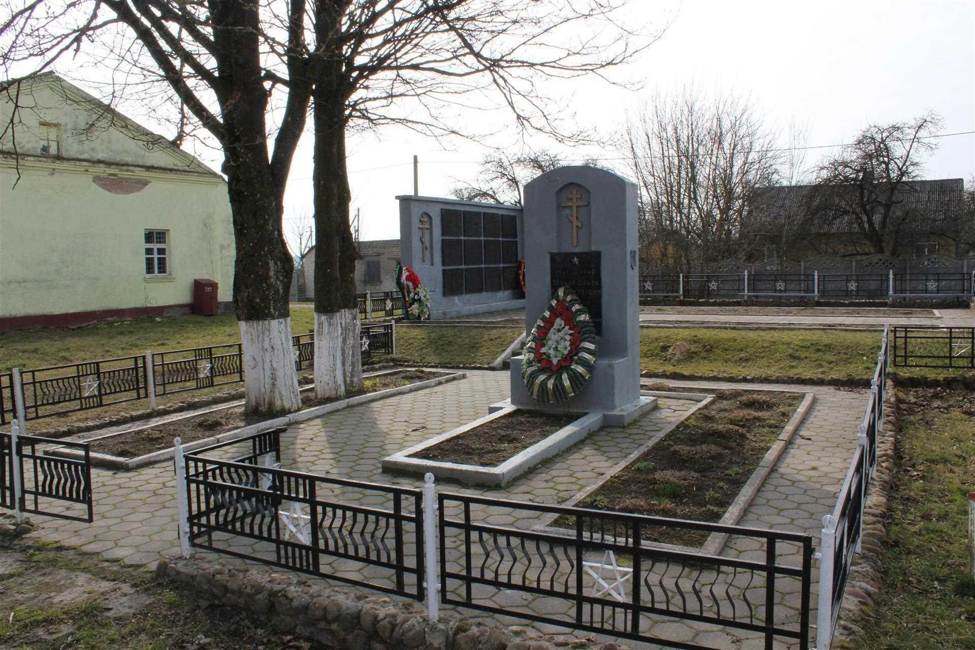 У 1949 г. быў усталяваны помнік - фігура савецкага воіна на цагляным пастаменце з надпісам-прысвячэннем. У 2004 г. абеліск замянілі на кампазіцыю, аўтарам якой стаў мясцовы мастак У.І. Бурнас. Помнік прадстаўляе сабой бетоннае прамавугольнае надмагілле з паўкруглым верхам. З левага боку ад помніка на ўзвышшы на невялікай адлегласці пастаўлена Г-падобная па канфігурацыі бетонная Сцяна Памяці. Ад надмагілля да Сцяны Памяці вядзе выкладзеная пліткай сцежка, пад’ём на ўзвышша аформлены прыступкамі. Комплекс пабудоў абнесены металічнай каванай агароджай.