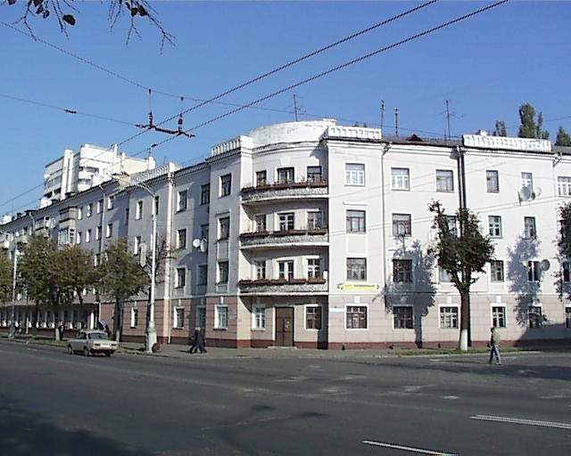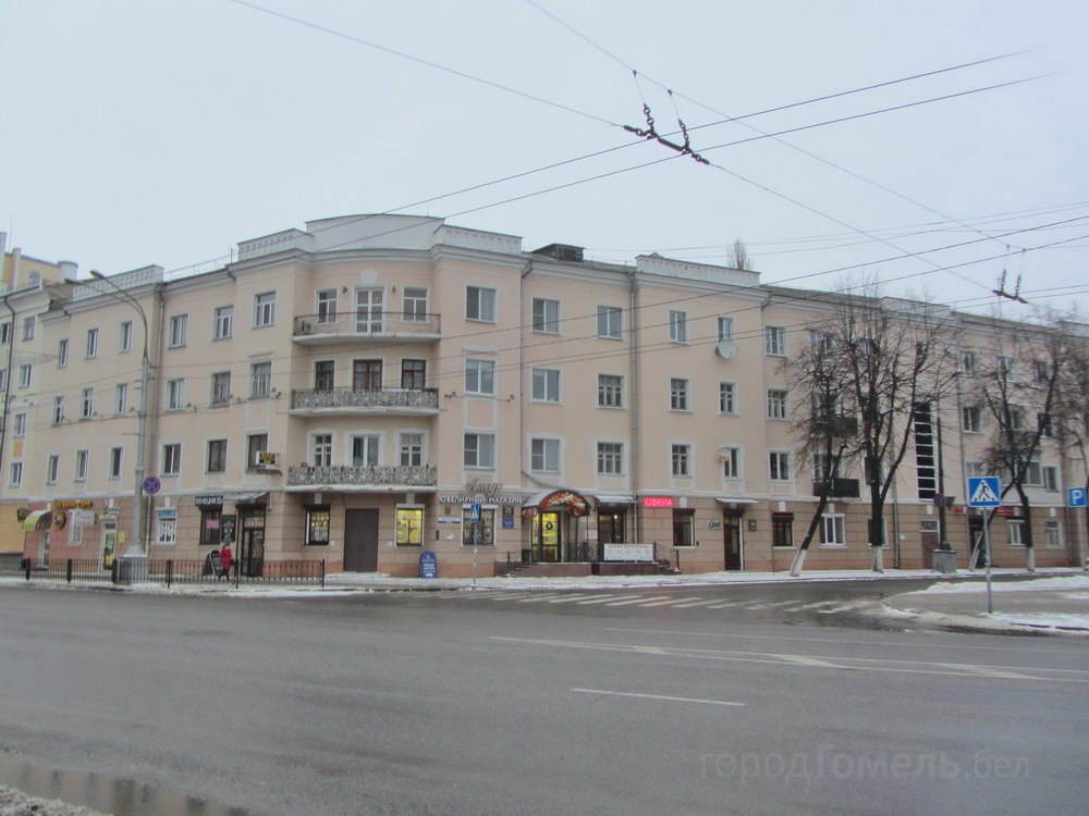 Чатырохпавярховы Г-падобны ў плане будынак. Вугал скруглены, фланкіраваны невялікімі рызалітамі, аформлены лоджыямі. Фасады вырашаны плоскасна, раскрапаваны неглыбокімі рызалітамі, завершанымі прамымі атыкамі, члянёны прамавугольнымі аконнымі праёмамі. Паміж 1-м і 2-м паверхамі паясок цягі. Сцяна 1-га паверха апрацавана рустам, вокны дэкарыраваны простымі ліштвамі з замковым камнем. Фасады завершаны шматслойным карнізам.