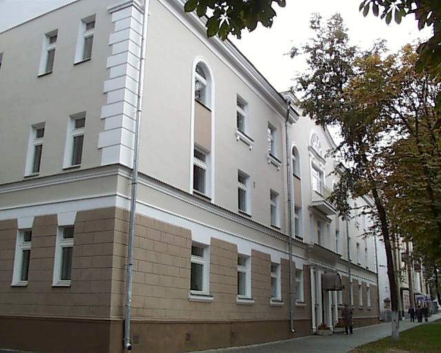 Трохпавярховы мураваны будынак сіметрычнай аб'ёмна-прасторавай кампазіцыі. Вось сіметрыі падкрэслена трохвугольным шчытом. Гарызантальна фасады падзелены міжпаверхавай цягай паміж 1-м і 2-м паверхамі, завершаны развітым карнізам. Першы паверх апрацаваны рустам. Дваровы фасад атынкаваны. У цэнтры размешчаны рызаліт з блокам лесвічнай клеткі.