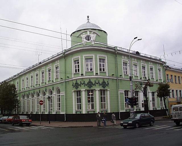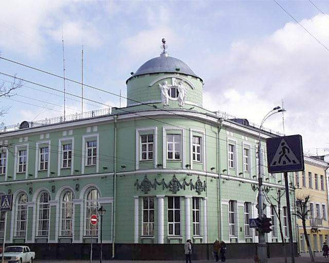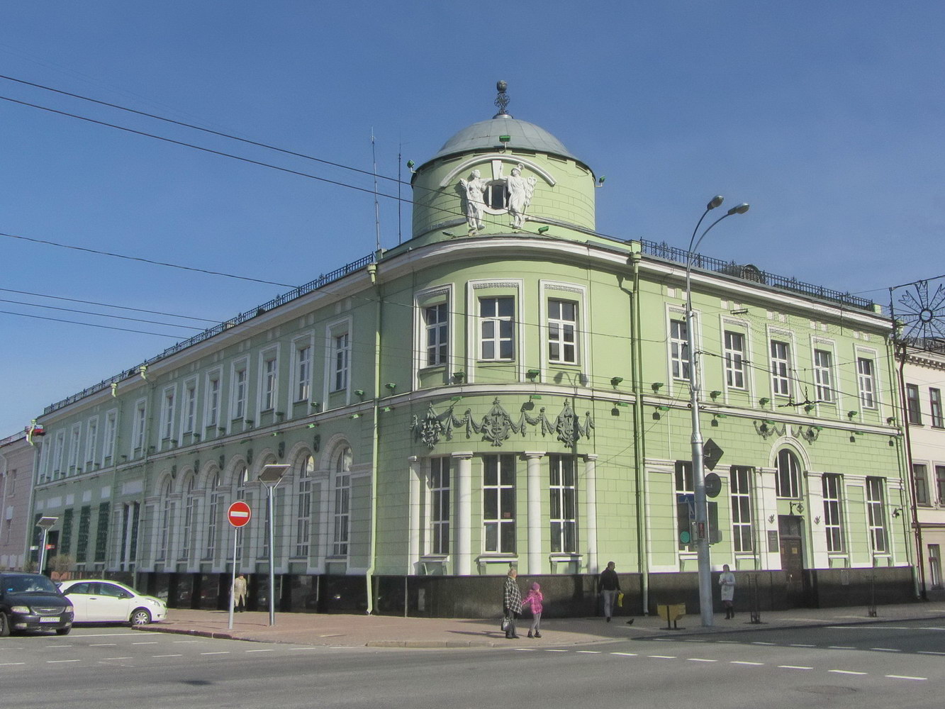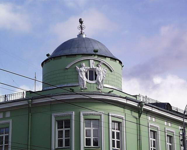 Двухпавярховы будынак на скрыжаванні вуліц Савецкай, 9 (вул. Румянцаўская) і Ланге, 14 (вул. Барона Нолькена) быў пабудаваны ў пачатаку XX ст. па праекце архітэктара Оскара Рудольфавіча Мунца ў стылі мадэрн. Г-падобны ў плане двухпавярховы будынак. Вуглавая частка скругленая, вылучана цыліндрычнай вежай з купалам. Фасады падзелены карнізнай цягай на 2 ярусы, ніжні ярус апрацаваны рустам. На плоскасці сцен -- тонкія ліштвы, маскароны, гірлянды. На вежы, па баках круглага дахавага акна, алегарычныя выявы 2 жаночых фігур у антычным адзенні.