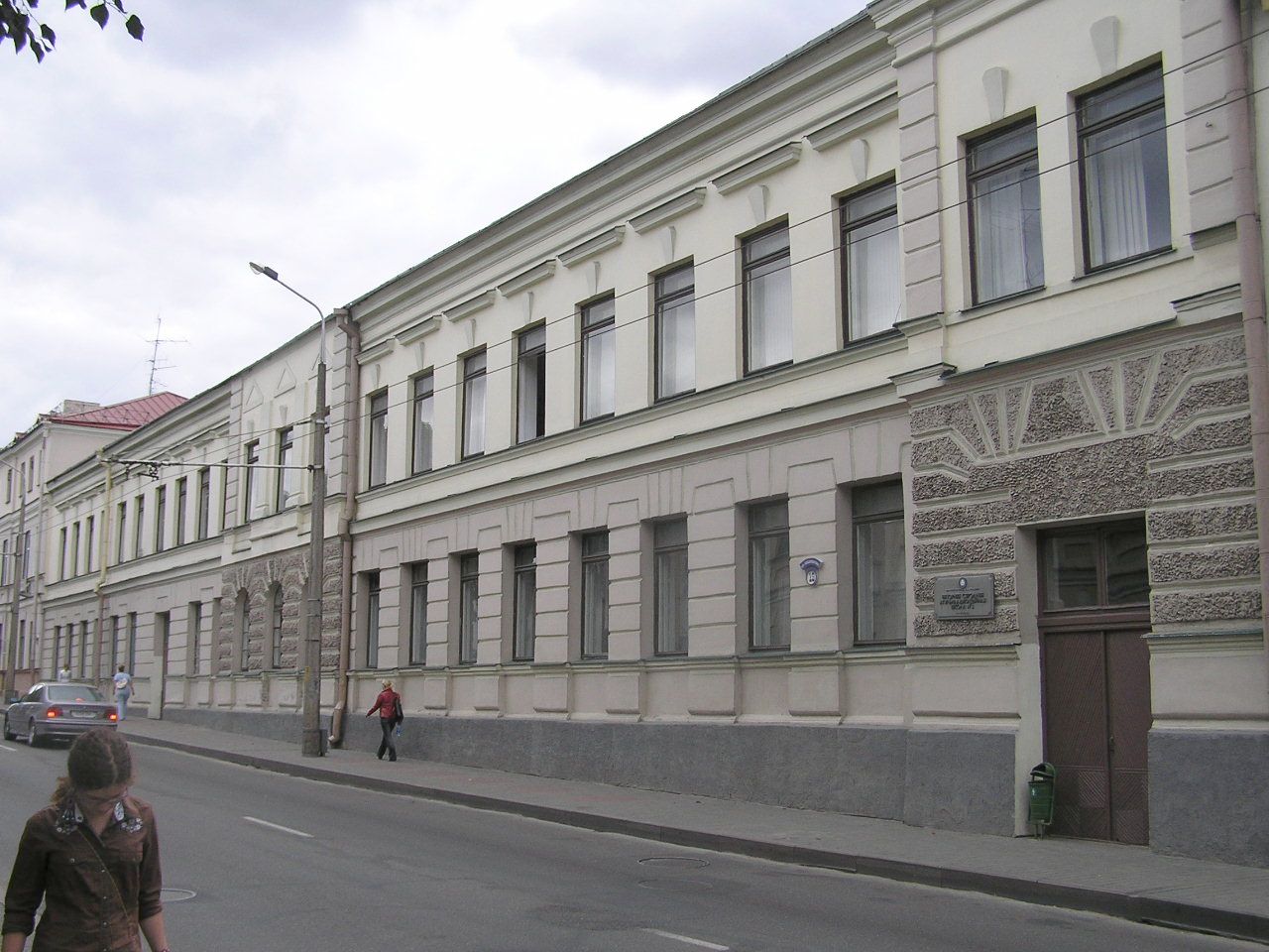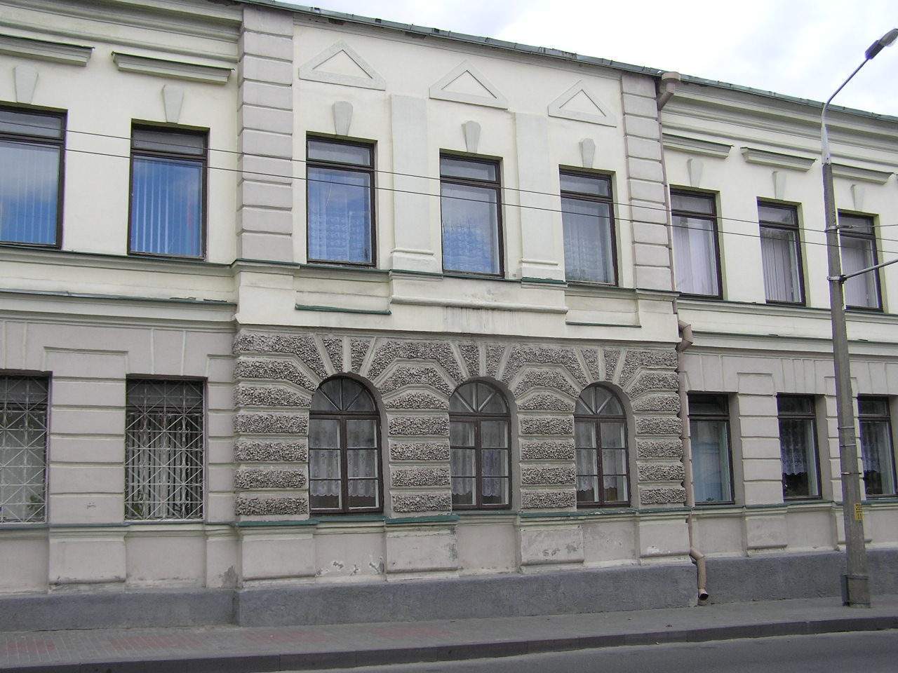 Будынак двухпавярховы з паўпадвалам, прамавугольны ў плане, накрыты двухсхiльным дахам. Тарцовымі фасадамі прымыкае да суседніх будынкаў. Фасады патынкаваныя. Галоўны фасад вылучаны цэнтральным і бакавым (з паўночнага боку) неглыбокімі рызалітамі. Па гарызанталі плоскасць фасада падзелена міжпаверхавымі і падаконнымі цягамі. Сцяна першага паверха члянёна прамавугольнымі аконнымі і 2-ма дзвярнымі праёмамі, у цэнтральным рызаліце 3 арачныя аконныя праёмы.