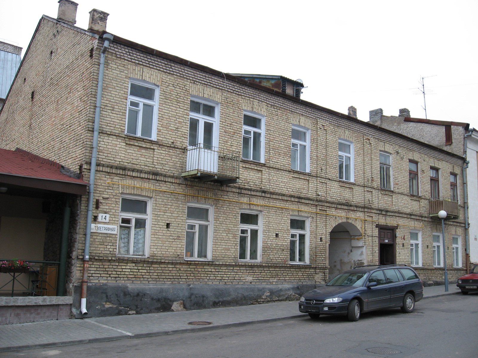 Дом па вуліцы Тэлеграфная № 14 пабудаваны ў 1898 г. Эклектыка. Мураваны прамавугольны ў плане двухпавярховы будынак накрыты двухсхільным дахам. Фасады не тынкаваныя. У цэнтры галоўнага фасада прахадная арка, фланкіраваная лапаткамі, дэкарыраванымі нішамі. Дэкор фасадаў спрошчаны. Галоўны фасад падзелены падаконнымі і міжпаверхавай цягамі, завершаны карнізам. Лучковыя аконныя праёмы аформлены клінчатымі перамычкамі, на другім паверсе пад вокнамі нішы.