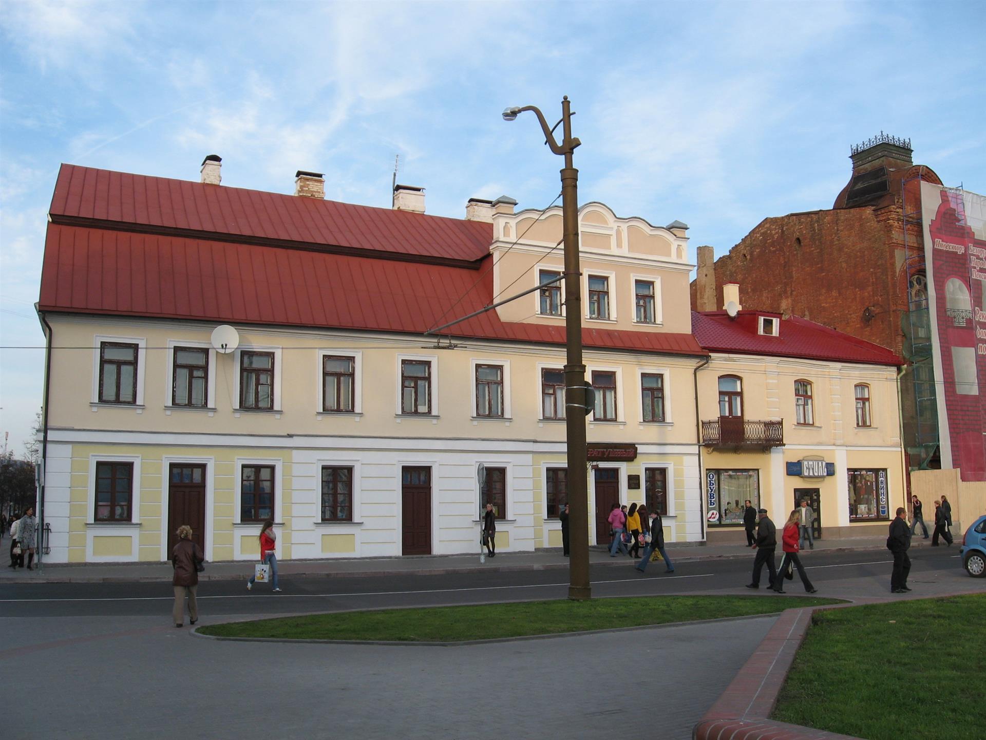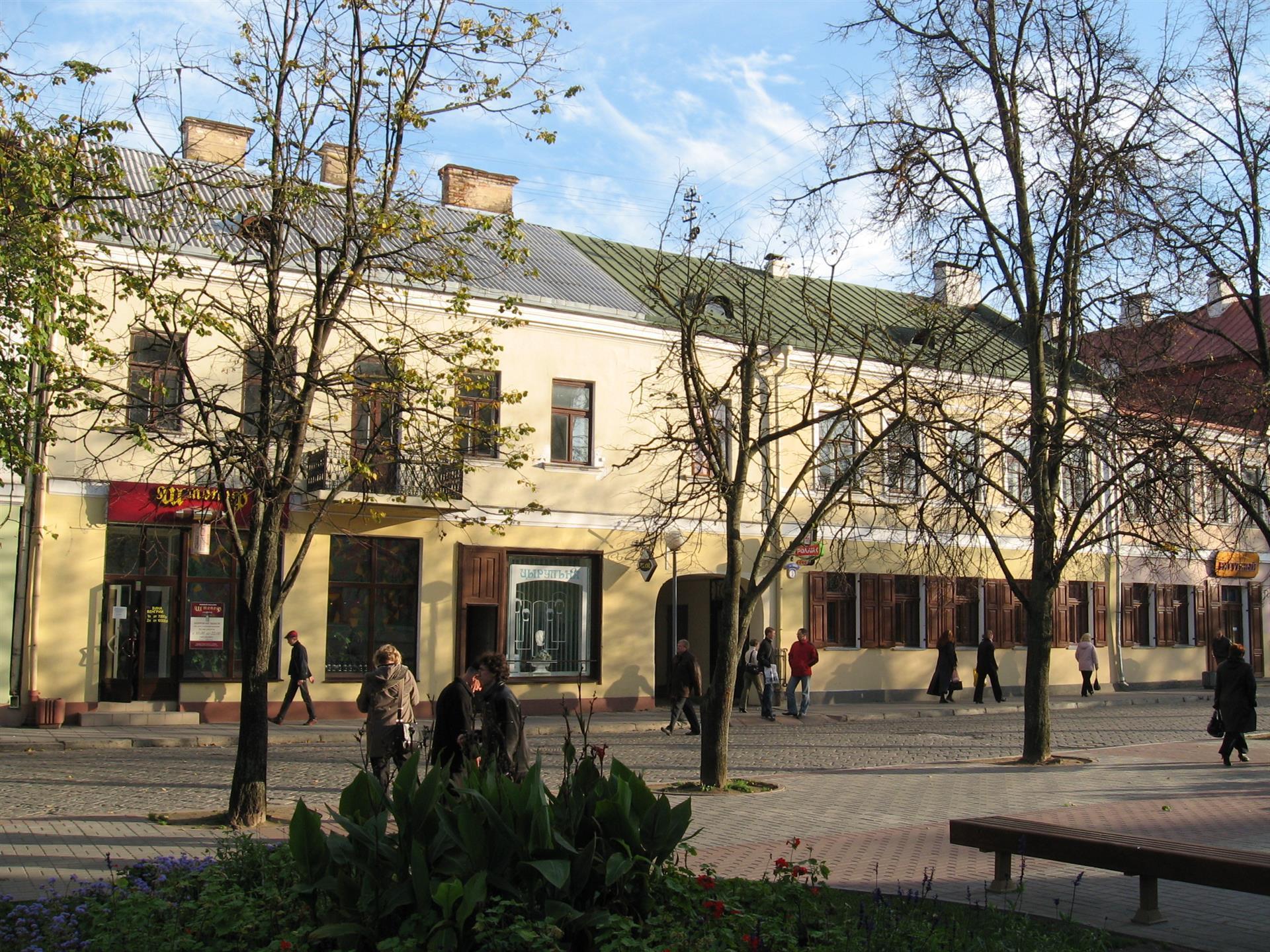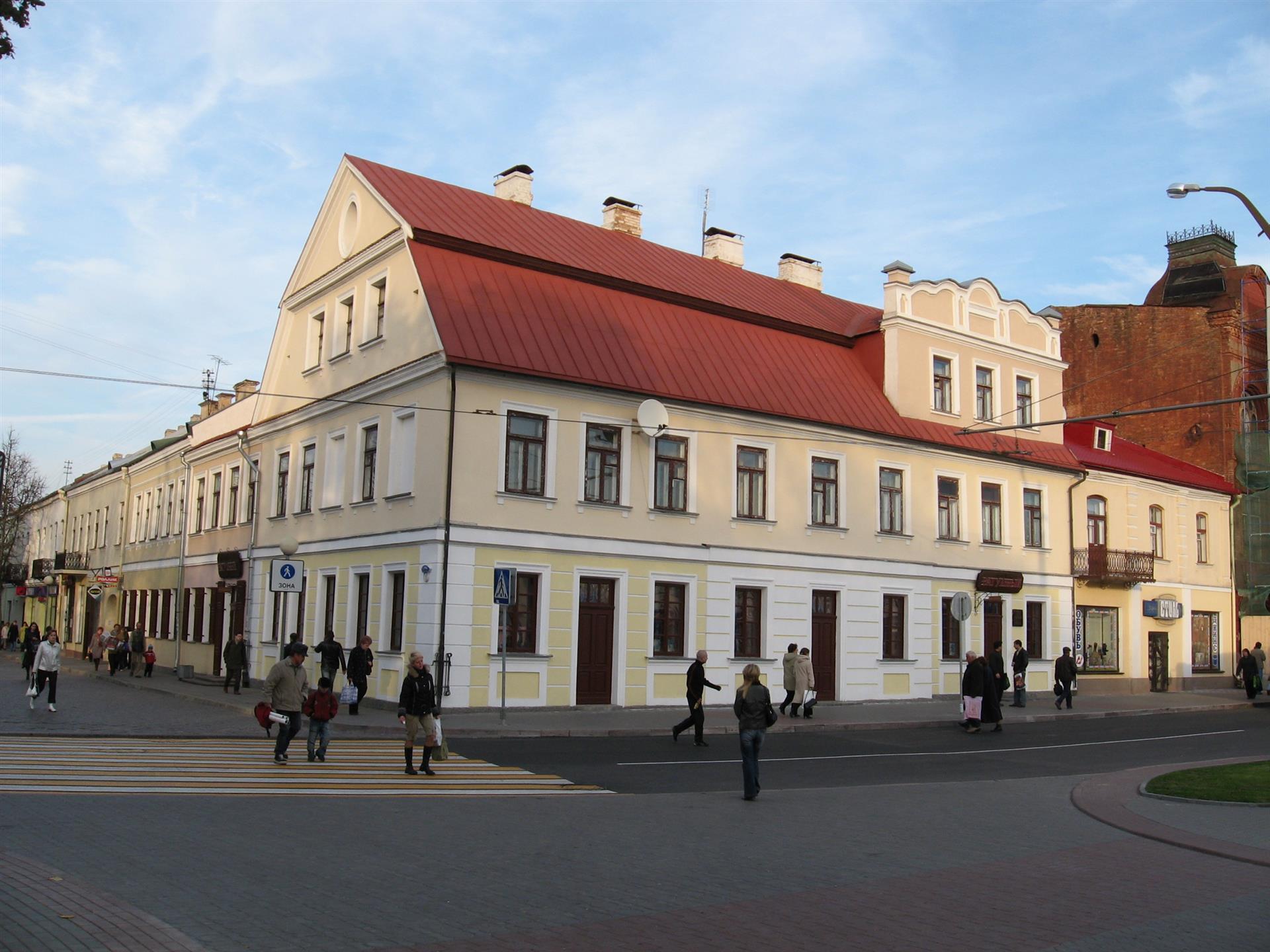 Будынак па вул. Савецкай № 1 паводле архіўных дадзеных пабудаваны ў 1851 г. на месцы ранейшых пабудоў (карчмы і камяніцы). Да дома прымыкаў аднапавярховы флігель. У 1885 г. у цэнтры г. Гродна адбыўся спусташальны пажар. Пасля пажару ў 1890 г. будынкі на пляцы былі адноўлены, пры гэтым раней аднапавярховы флігель па фронту вул. Савецкай перабудаваны ў двухпавярховы. Затым у 1895 г. да яго ўздоўж вуліцы быў прыбудаваны новы двухпавярховы аб'ём, злучаны праязной аркай. З 1922 г. тут працавала крама канцтавараў Хацкеля Міроўскага.