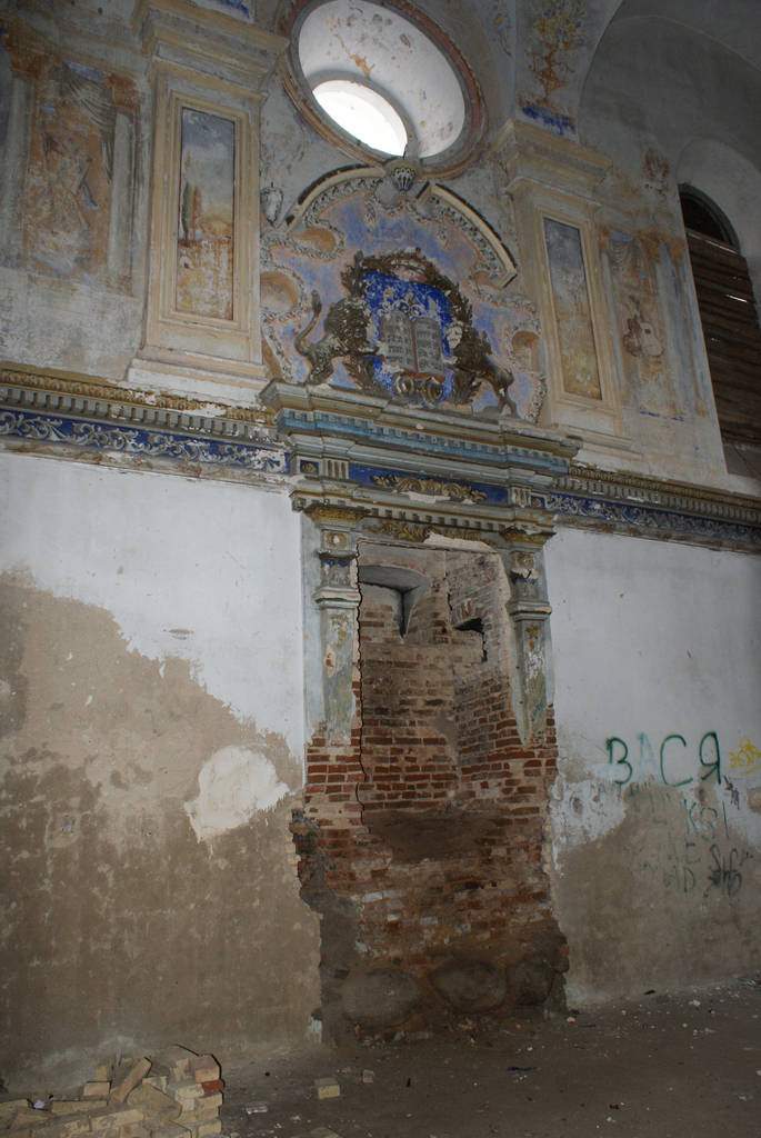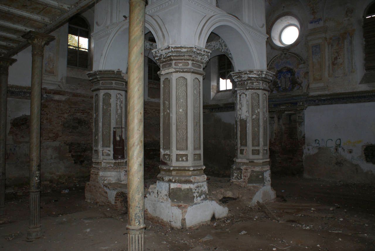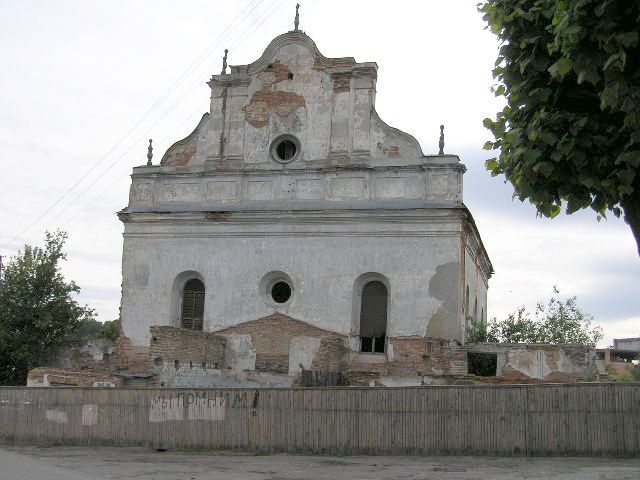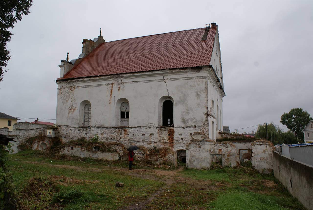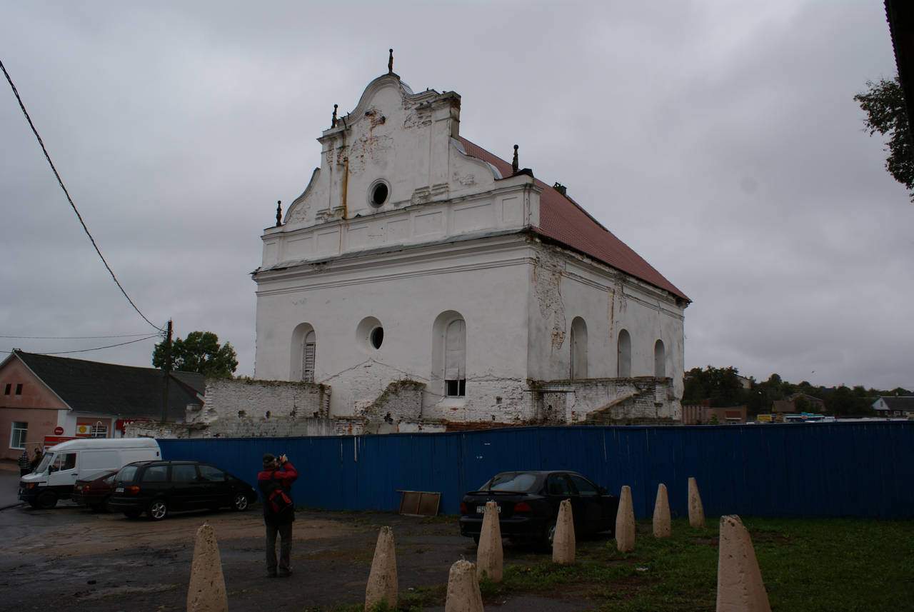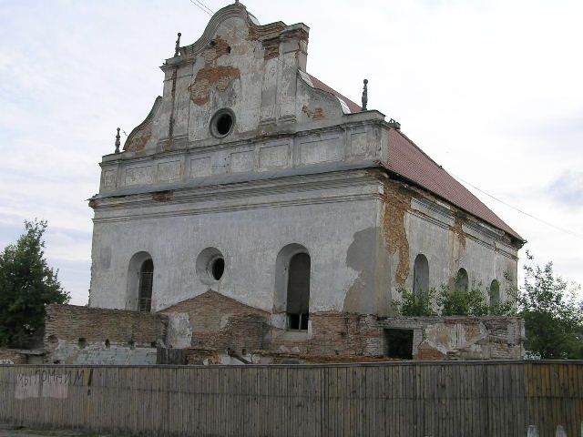 Сінагога - квадратны ў плане цагляны будынак пад высокім двухсхільным дахам, узведзены па ўстаноўленай у XVII - XVIII стст. для гэтага тыпу культавых збудаванняў цэнтрычнай дзевяціпольнай планіровачнай схеме: канструкцыя перакрыцця вырашана дзевяццю скляпеністымі пралётамі. Асноўны аб'ём па перыметры абнесены радам нізкіх пазнейшых пабудоў (цяпер напалову разбураныя). Цэнтрычнасць збудавання падкрэслена і двух'яруснымі фасадамі, якія маюць трохвосевую сіметрычную кампазіцыю.