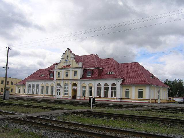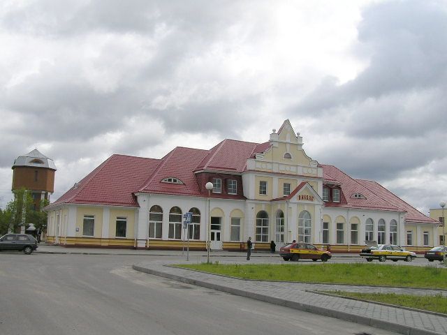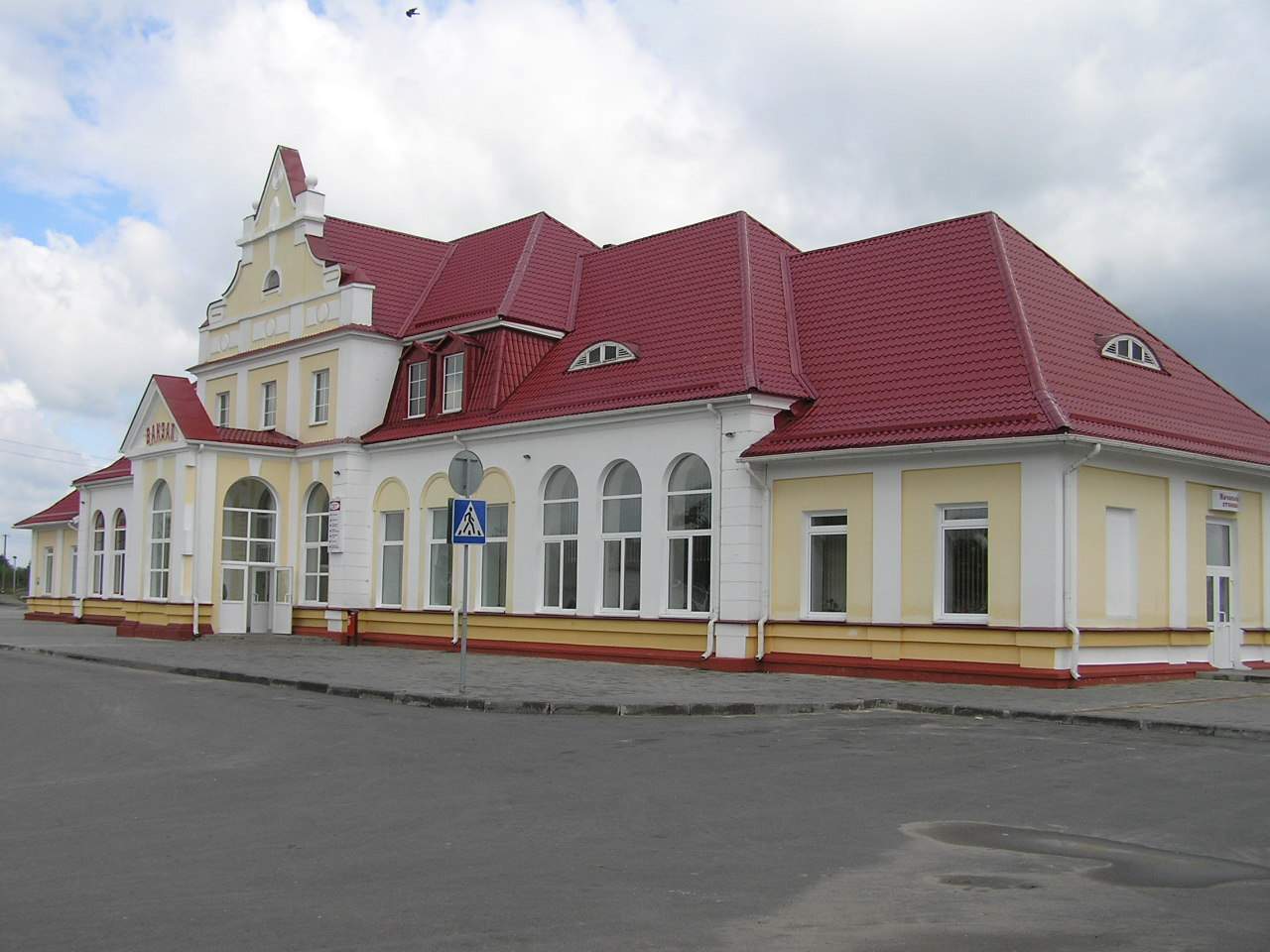 Прамавугольны ў плане аднапавярховы будынак мае высокі мансардавы дах складанага пластычнага малюнка. Прасторавае развіццё кампазіцыі дасягаецца трохступеньчатым павелічэннем аб'ёмаў, якое нарастае к цэнтру: ад адносна нізкіх бакавых крылаў праз цэнтральны корпус да мансардавага паверха. Спалучэнне вальмавых дахаў аб'ёмаў будынка надае яго завяршальнай частцы складаны ярусны сілуэт. Дамінуючы элемент кампазіцыі - цэнтральны рызаліт з двух'ярусным шчытом, устаноўленым на нізкі парапет. Плаўныя крывалінейныя абрысы шчыта, завяршэнне яго вуглоў акратэрыямі ў выглядзе шароў вылучаюць гэты элемент на фоне геаметрычна правільных чляненняў фасадаў. Пластычнасць экстэр'еру вакзала надаюць рустоўка, рытм прамавугольных і арачных аконных праёмаў, барочныя рэмінісцэнцыі ў форме "разарванага" франтона, фігурант шчыт са стылізаванымі валютамі.