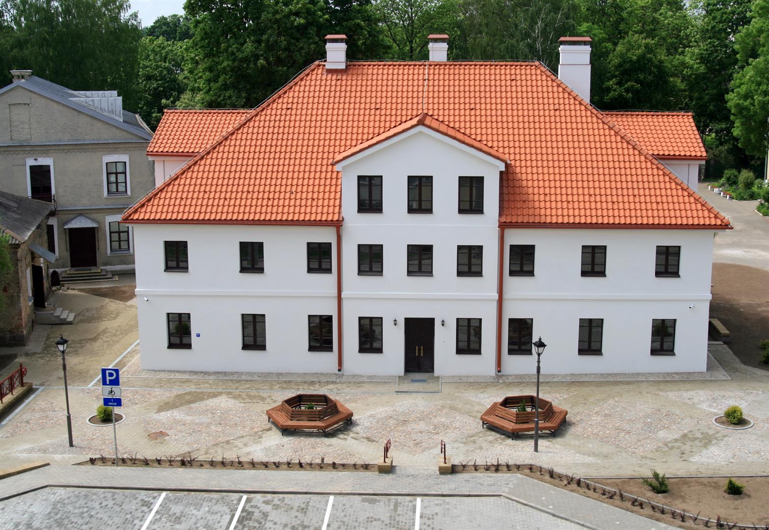 Будынак двухпавярховы, прамавугольны ў плане. Вальмавы дах з мансардамі на тарцовых фасадах з’яўляецца асноўным элементам кампазіцыі.