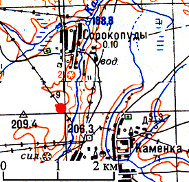Магілёўская вобласць, Горацкі раён, в. Саракапуды, 0,8 км на поўдзень ад вёскі, на правым беразе р. Калінаўка, ва ўрочышчы Паўночны Роў