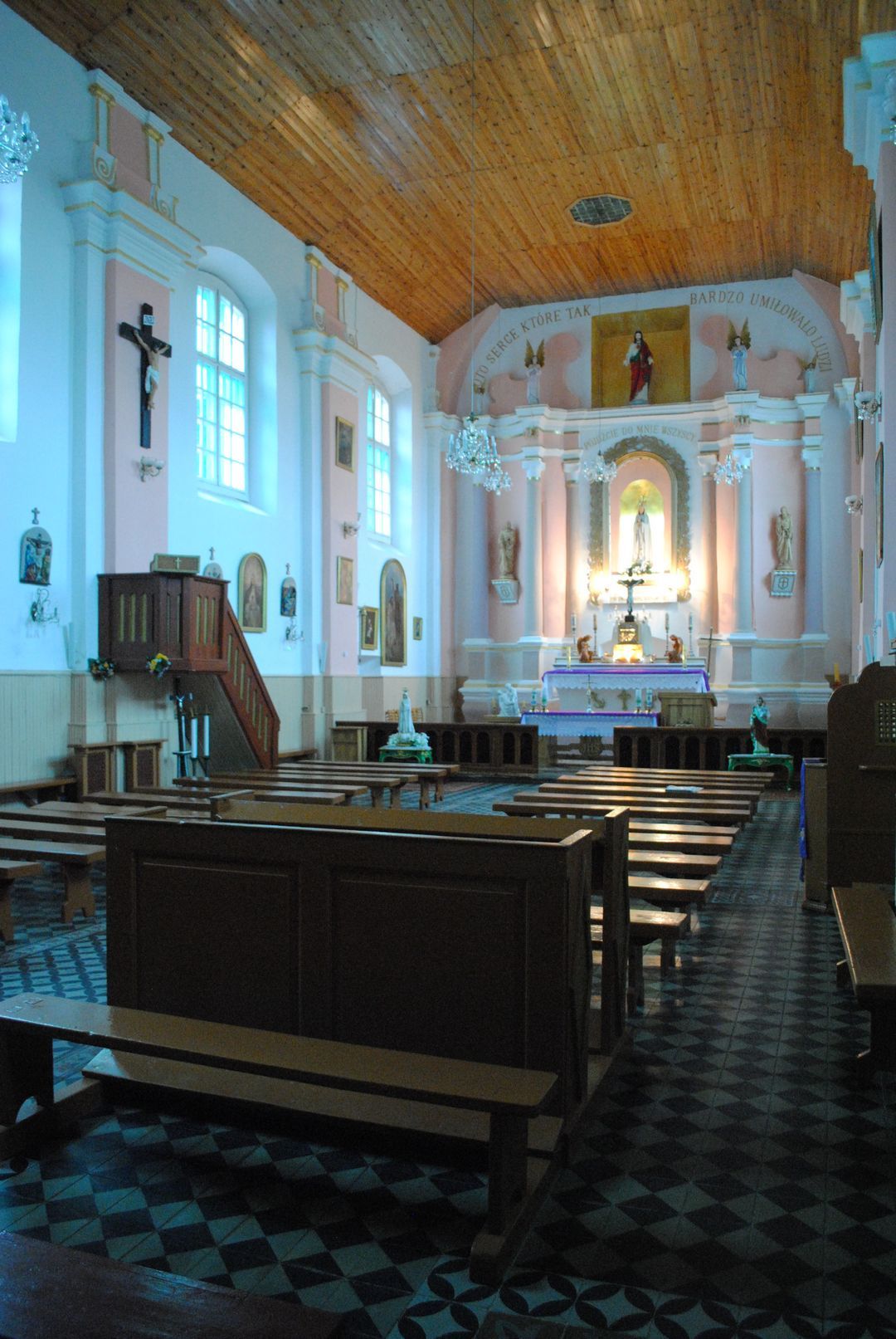 Касцёл Беззаганнага Зачацця Дзевы Марыі быў пабудаваны ў стылі позняга барока, адносна невялікі па памерах, з адной сакрысціяй у др. пал. XVIII ст. Галоўны фасад быў завершаны барочным франтонам з валютамі. Пад алтаром і часткай касцёла мелася крыпта са склепамі. Першапачаткова ў касцёле былі чатыры алтары. У галоўным алтары ў атачэнні шасці стройных калонаў іанічнага ордэра, што падтрымліваюць шматслойны карніз, у XVIII ст. быў змешчаны абраз Найсвяцейшай Панны Марыі, вакол якой у аблоках луналі 6 анёлаў. Кампазіцыю вянчала выява Св. Духа. Галоўны алтар фланкавалі два бакавыя 2-ярусныя алтары. На жаль, арыгінальнае аздабленне алтара не захавалася.