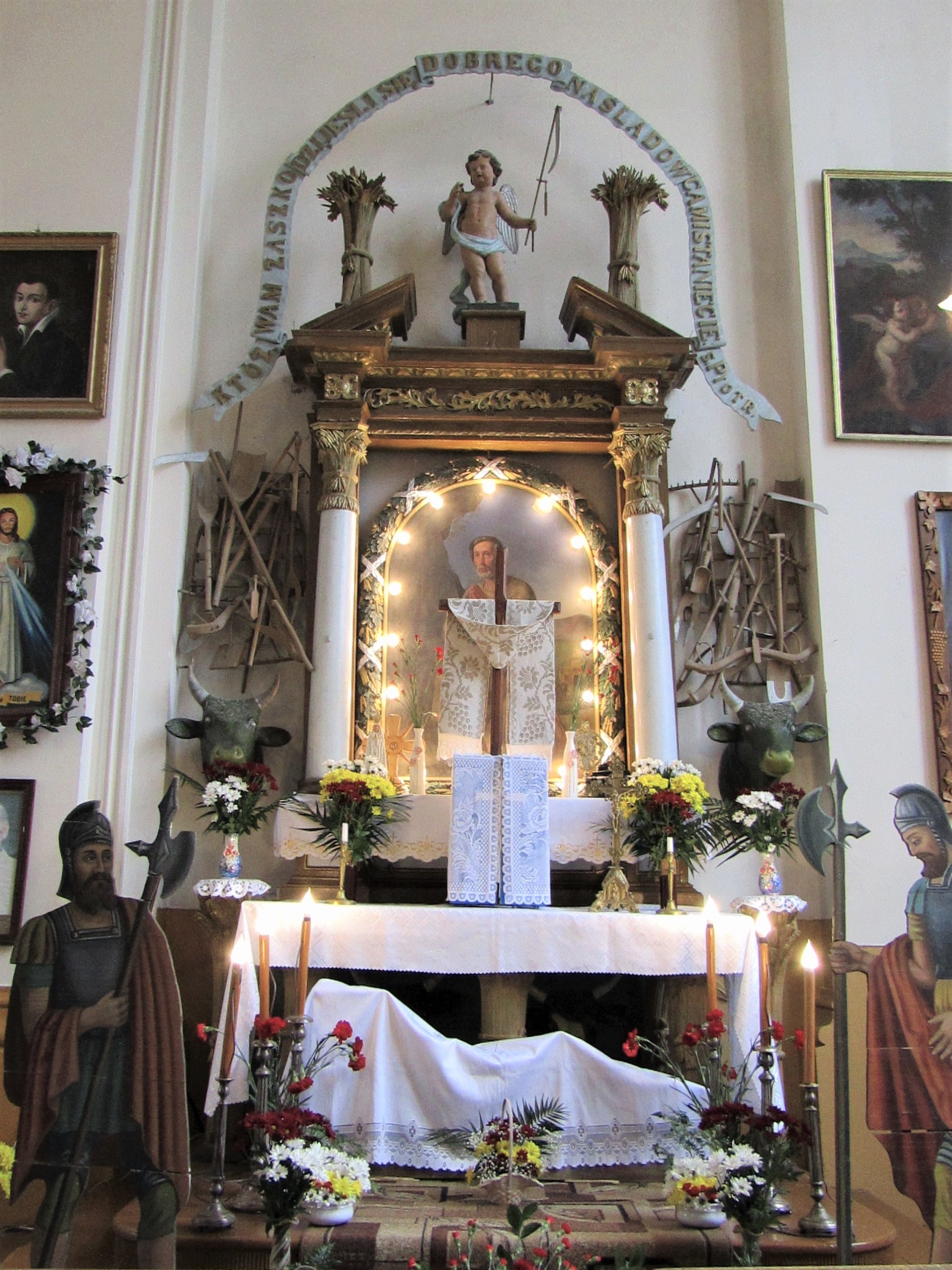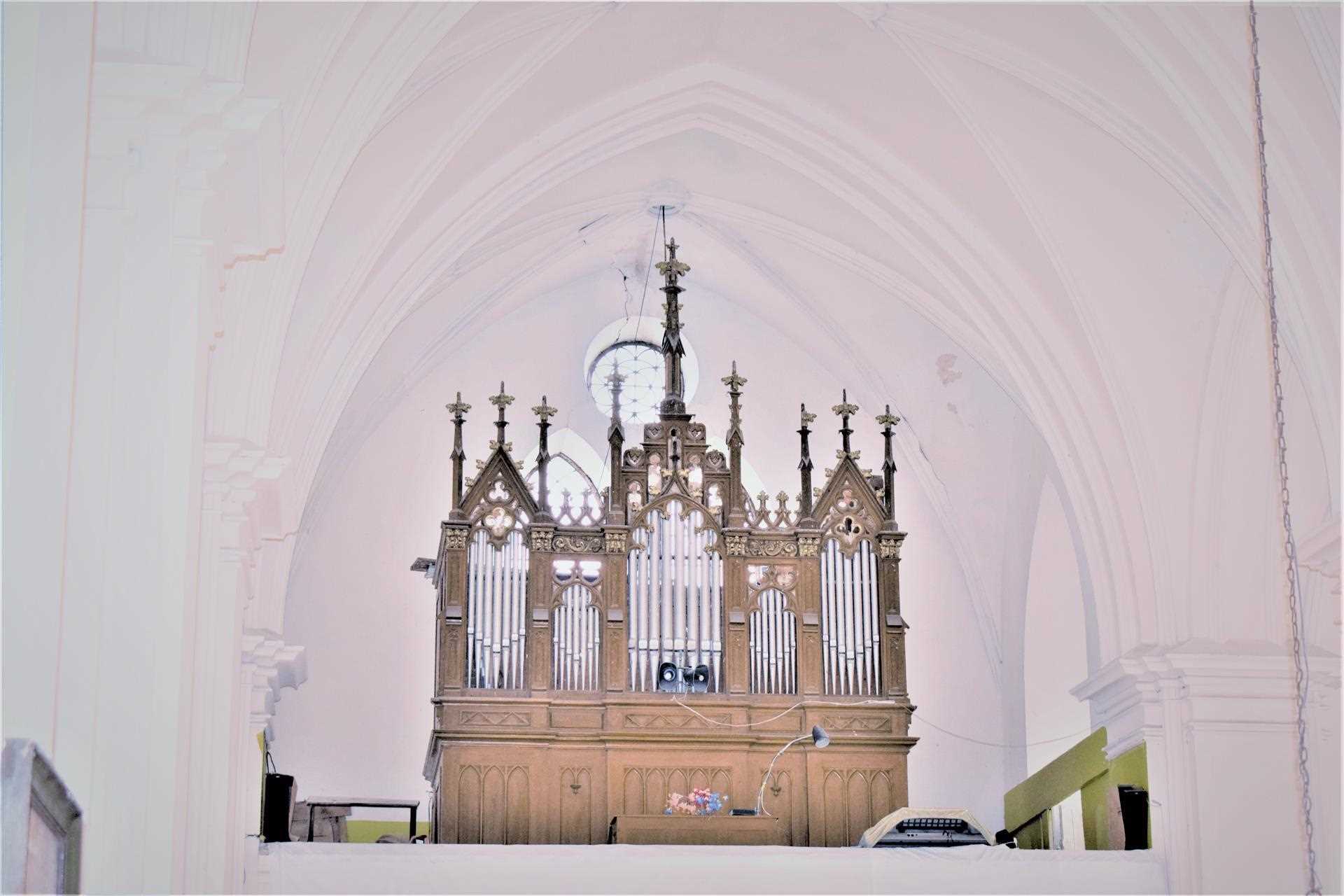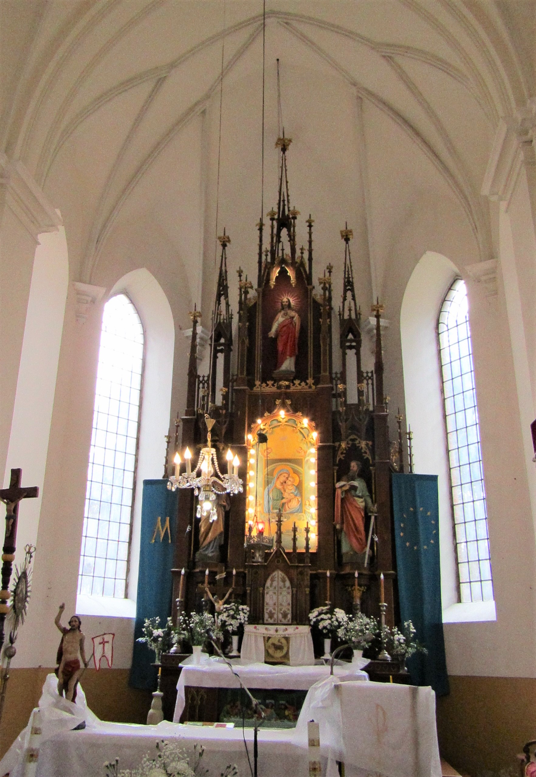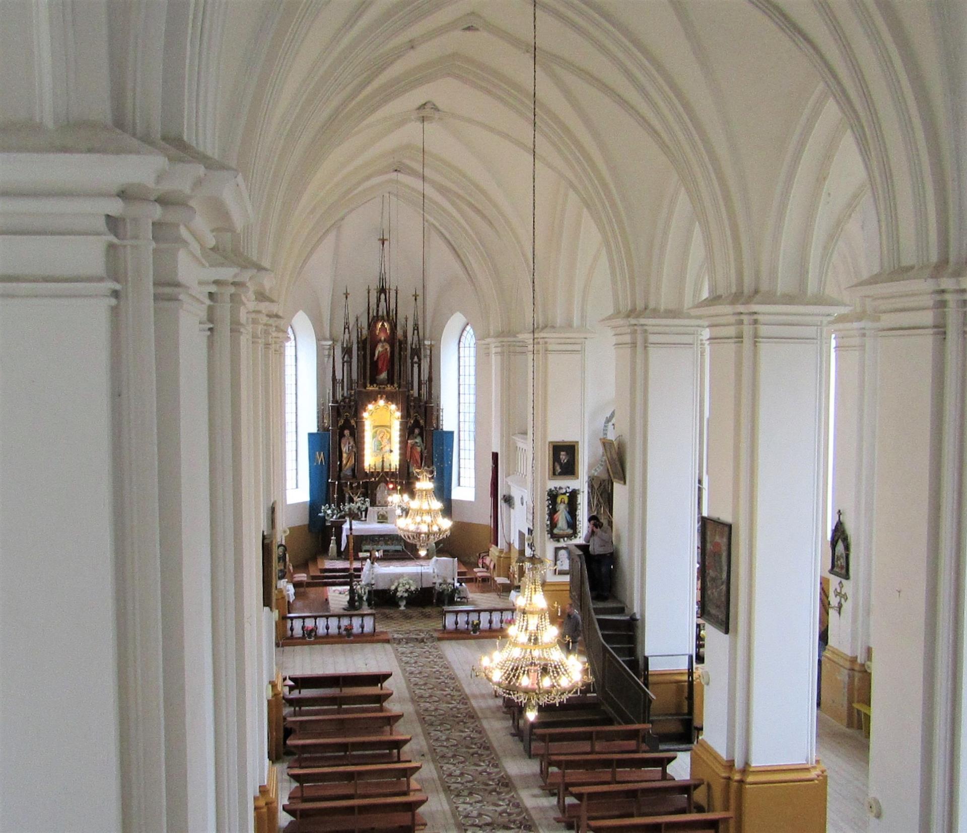 Унутраная простора падзелена 8 слупамі на 3 нефы і шырокі трансепт, якія перакрыты цыліндрычнымі і крыжовымі скляпеннямі. Над уваходам размешчаны арганныя хоры.