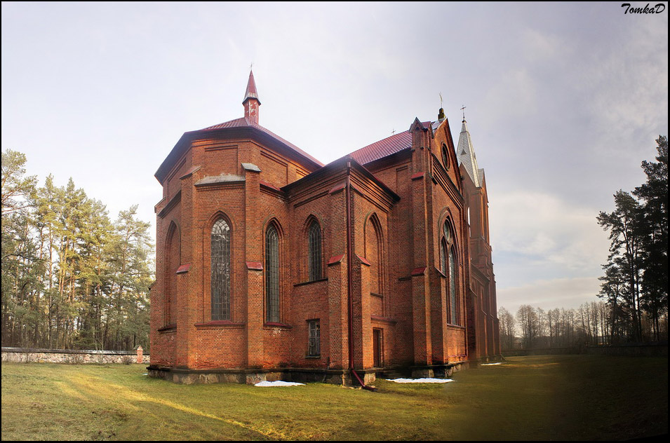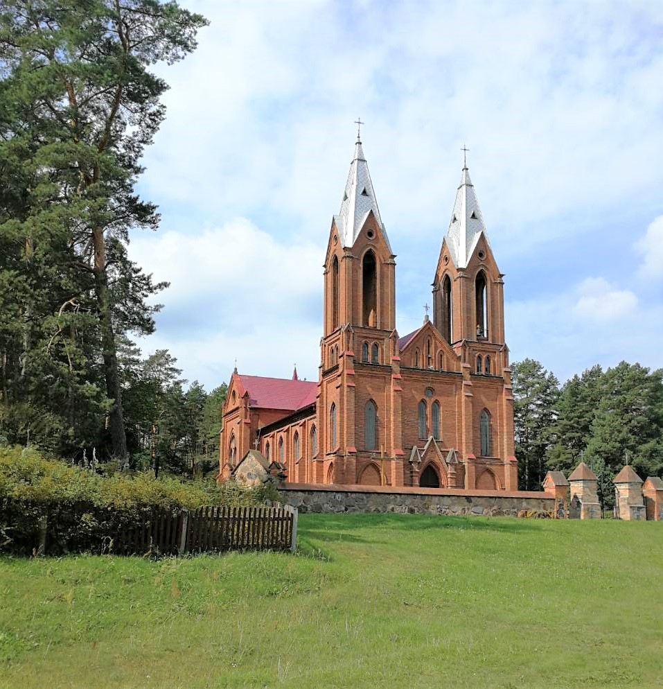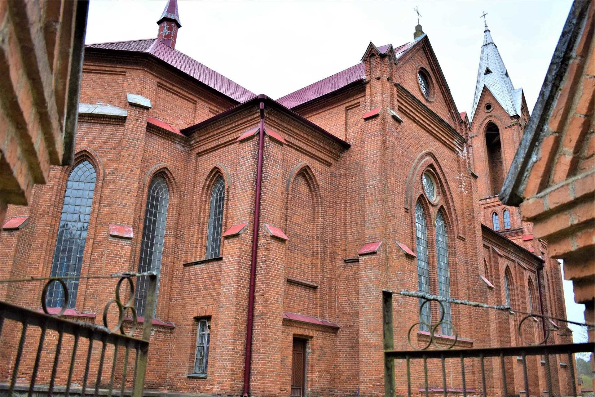 Будынак касцёла - трохнефавая двухвежавая базіліка з трансептам і пяціграннай алтарнай часткай. З боку да галоўнага фасада прымыкаюцъ дзве чатырохгранныя вежы-званіцы з высокімі шпілямі. Фасады касцёла і вежаў умацаваны ступеньчатымі контрфорсамі. Бакавыя фасады асноўнага аб'ёму храма ў прасценках паміж контрфорсамі прарэзаны спічастымі высокімі вокнамі ў абрамленнях. Тарцовыя фасады трансепта фланкіраваны контрфорсамі, члянёны высокім акном біфорыумам у абрамленні, завершаны трохвугольным франтонам з акном-ружай. Апсіда і сакрысціі таксама раскрапаваны контрфорсамі з лапаткамі, члянёны спічастымі аконнымі праёмамі і нішамі-блендамі ў абрамленнях.