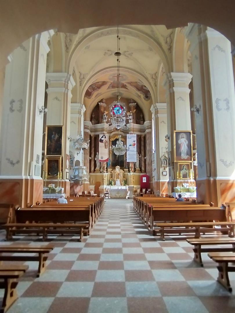 Касцёл трохнефавы, з прамавугольнай алтарнай часткай, якая прадаўжае цэнтральны неф, і 2 квадратнымі ў плане нізкімі сакрысціямі. Будынак завершаны высокім двухсхільным чарапічным дахам з вальмамі над алтарнай часткай. Кампазіцыя галоўнага фасада двух'ярусная, завершана трохвугольным франтонам з выявай Усебачнага вока. Плоскасці галоўнага і бакавых фасадаў расчлянёны пілястрамі і арачнымі аконнымі праёмамі ў простых ліштвах.