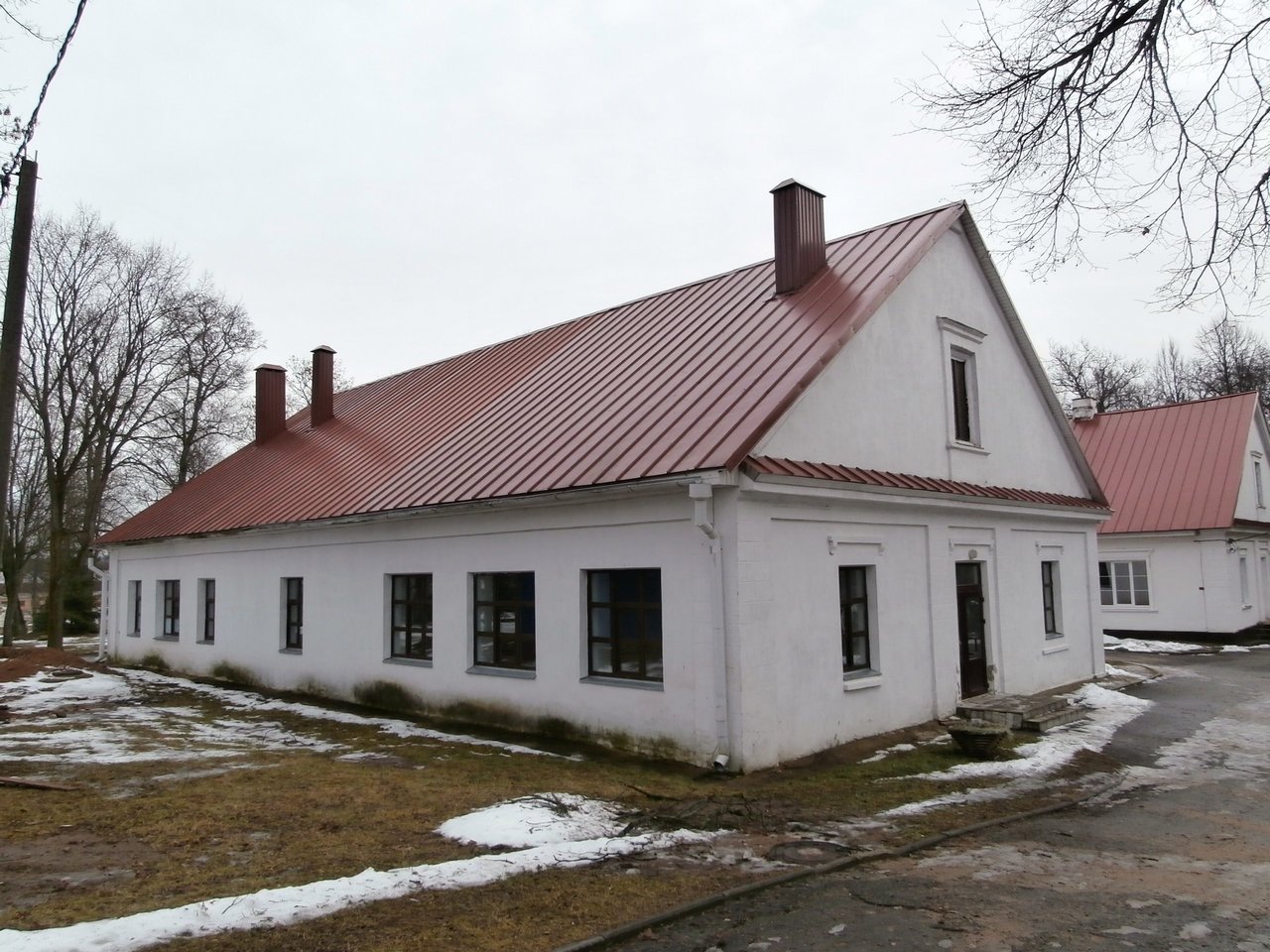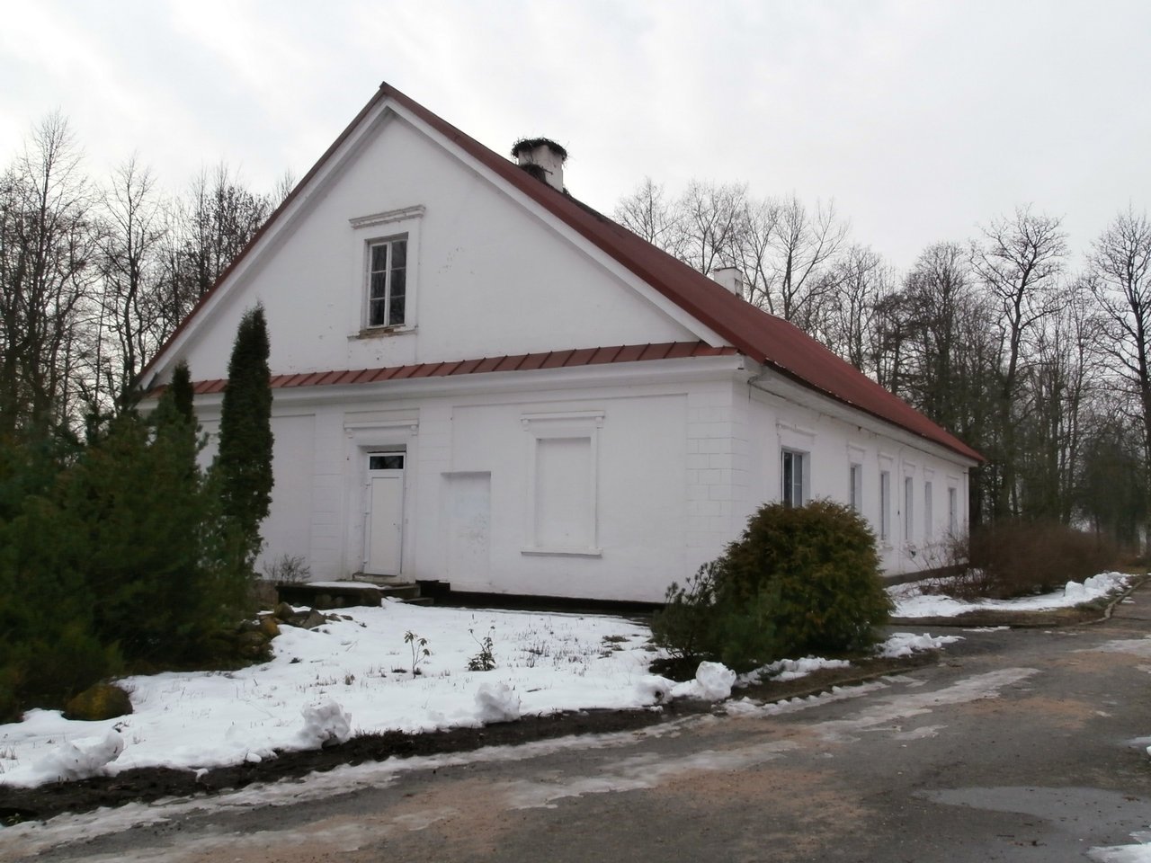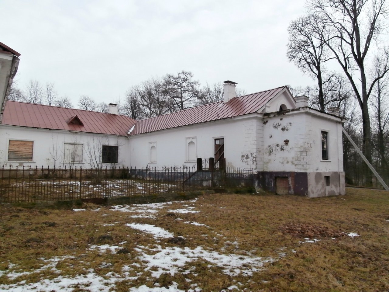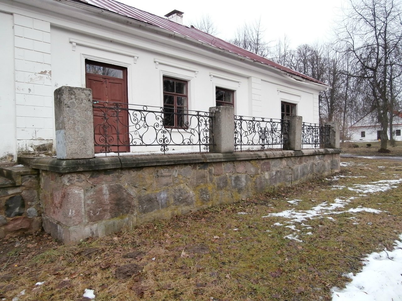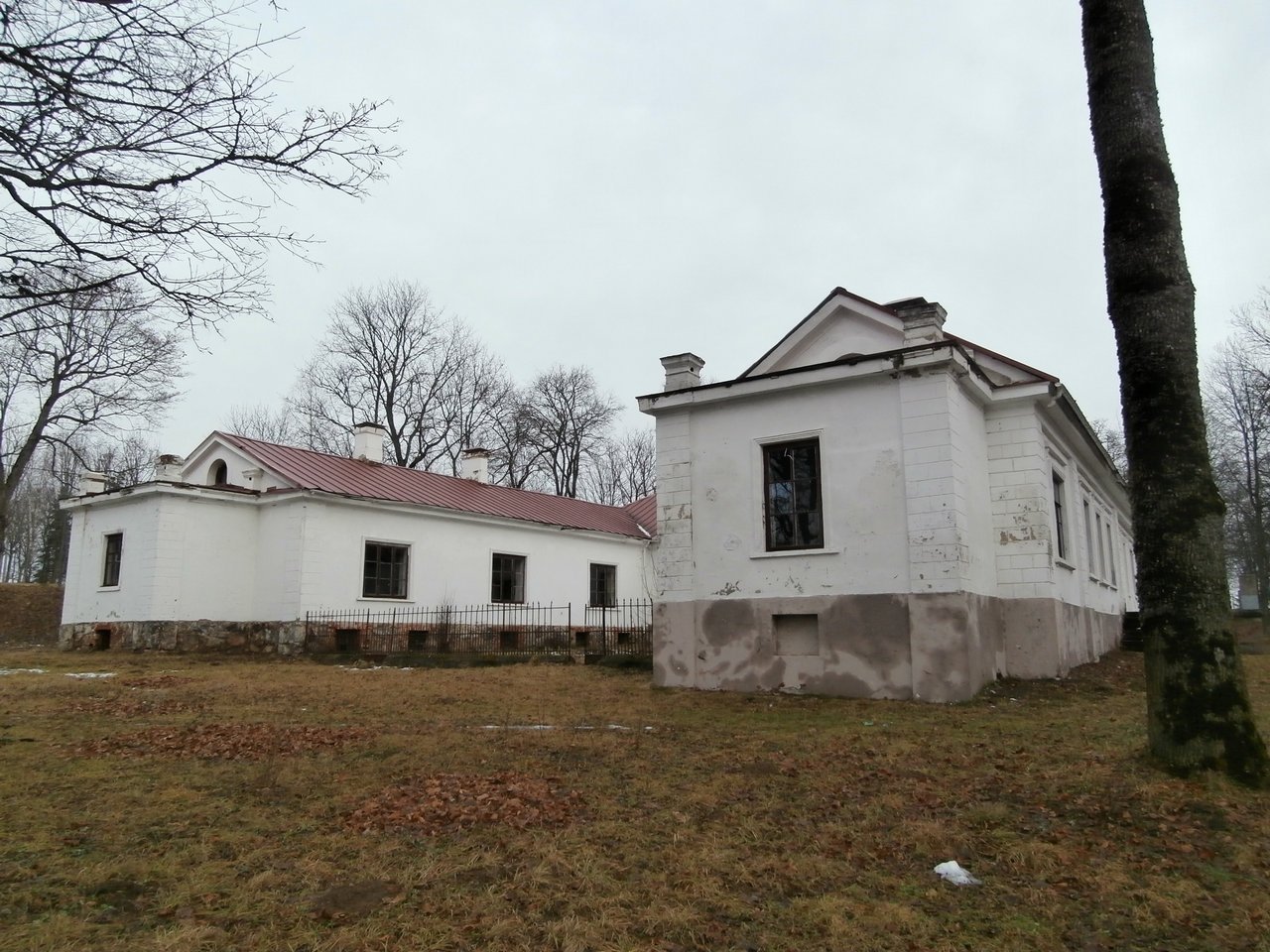 Насупраць сядзібнага дома размешчаны два аднатыпныя службовыя флігелі. Як паказалі натурныя даследванні, адзін з флігеляў стаіць на падмурках раней існаваўшага будынка. Аднак звестак аб больш ранняй забудове сядзібы не захавалася. У пісьмовых крыніцах толькі ўпамінаюцца "господские" пабудовы, вінакурня і млын, існаваўшыя пры папярэдніх уладальніках. Свіран пабудаваны з бутавага каменю.