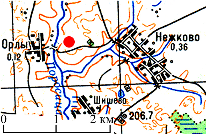 Магілёўская вобласць, Горацкі раён, в. Нежкава, 1 км на захад ад вёскі, на левым беразе р. Паросіца