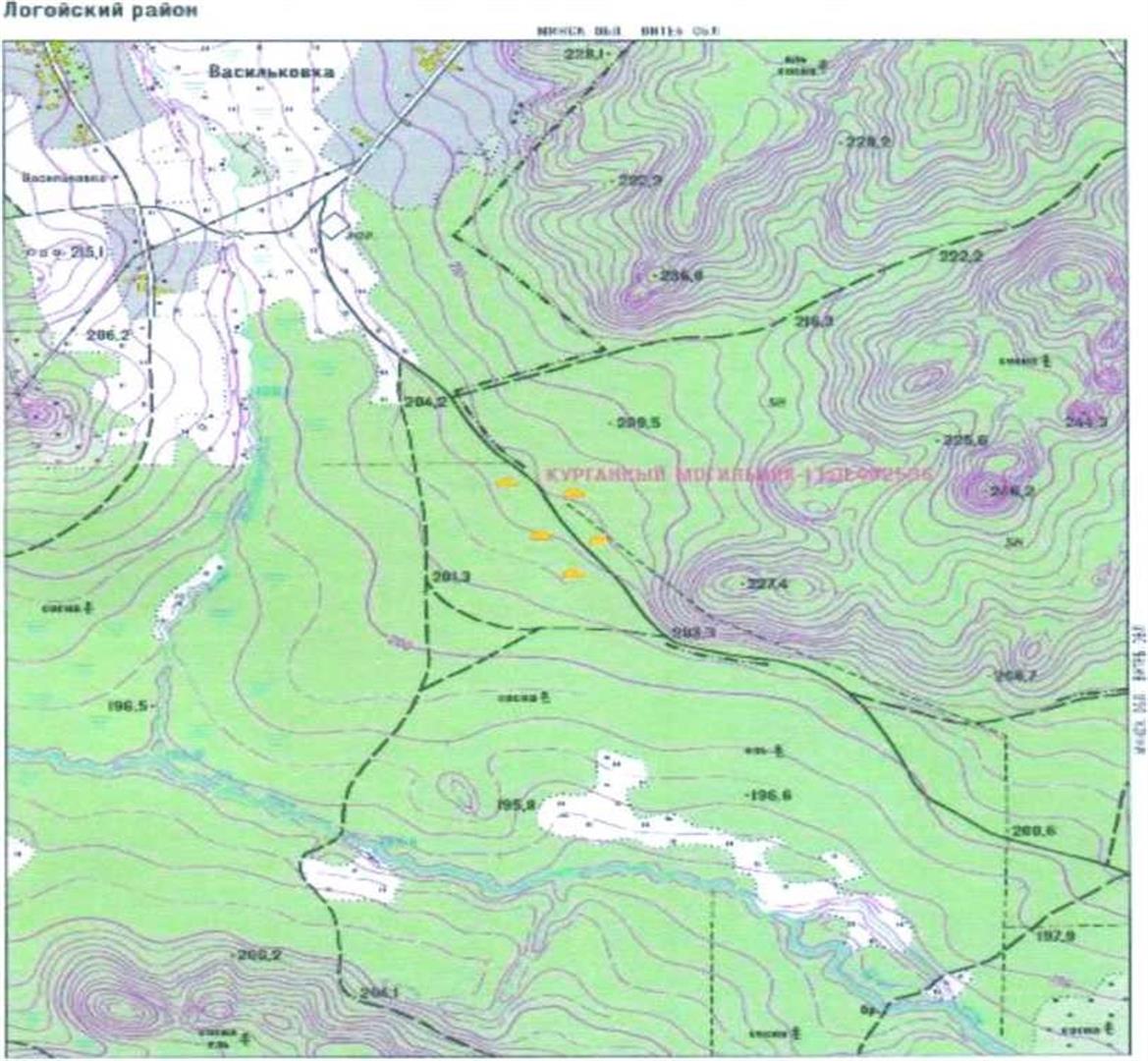 Курганны могільнік-1 знаходзіцца за 1 км ад в. Васількоўка, у лесе. Налічвае менш за 20 курганоў. Многія пашкоджаны скарбашукальніцкімі ямамі. Адкрыў і даследваў 2 насыпы ў 1962 г. А.Р. Мітрафанаў, у 1976 г. М.І. Лашанкоў. Падчас раскопак было знойдзена пахаванне па пахавальным абрадзе трупаспаленне, размешчанае 5 ярусамі. Пахавальны інвентар адсутнічаў. У адным з курганоў знойдзены гаршчок конусападобнай формы.
