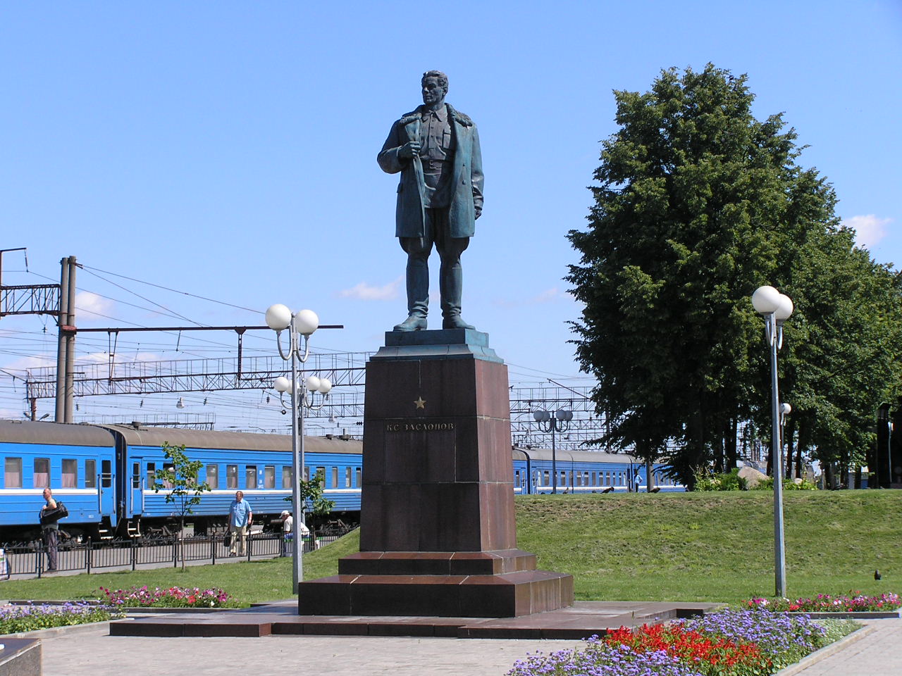 Бронзавая фігура К.С. Заслонава пастаўлена на чырвоным гранітным пастаменце строга прамавугольнай формы.
