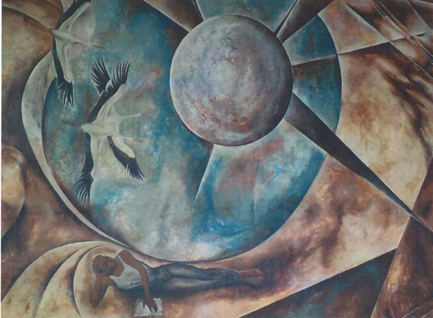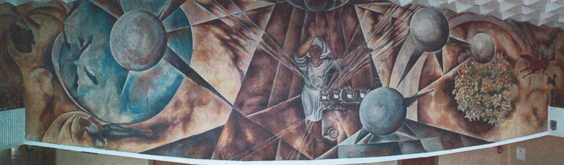 Манументальнае пано складаецца з трох частак, якія арганічна перацякаюць адна ў другую. Яблыкі і коні, буслы, якія быццам купаюцца ў глыбіні неба, жанчына з хлебам каля магілы невядомага салдата, сучасная работніца тэкстыльнай прамысловасці, хлопец з раскрытай кнігай -- усе гэтыя вобразы кампазіцыйна аб'яднаны светавымі кругамі і сферамі: менавіта ў іх і сярод іх развіваюцца сюжэтныя дзеянні.