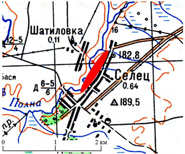 Магілёўская вобласць, Горацкі раён, в. Сялец, на левым беразе р. Пална, на агародах вёскі