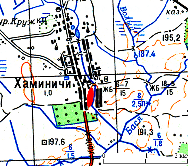 Магілёўская вобласць, Горацкі раён, в. Хамянічы, на правым беразе р. Хамінічы, на агародах вёскі па вул. Ленінскай