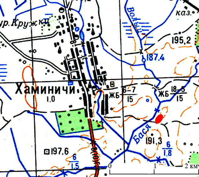 Магілёўская вобласць, Горацкі раён, в. Хамянічы, 1,5 км на ўсход ад вёскі, на левым беразе р. Бася
