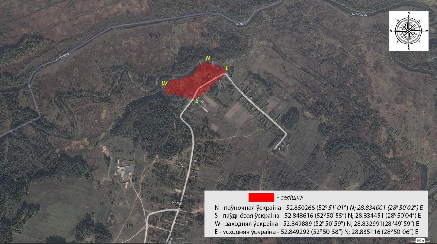 Селішча ранняга жалезнага веку і эпохі Старажытнай Русі знаходзіцца на паўночны ўсход ад вясковых могілак да старыцы ракі Пціч і на прысядзібных участках мясцовых жыхароў. У агаленнях горных парод бачны культурны слой, маюцца скопішчы камянёў. Магутнасць культурнага слою — 0,2-0,4 м. Знойдзена ляпная гладкасценная кераміка. У паўночнай частцы селішча прасочваецца мыс памерам 30 на 15 мм, на якім былі прыкметны рэшткі ахоўнага вала і рова, магчыма, гарадзішча. Знойдзена ляпная гладкасценная кераміка. Агульная плошча селішча каля двух гектараў.