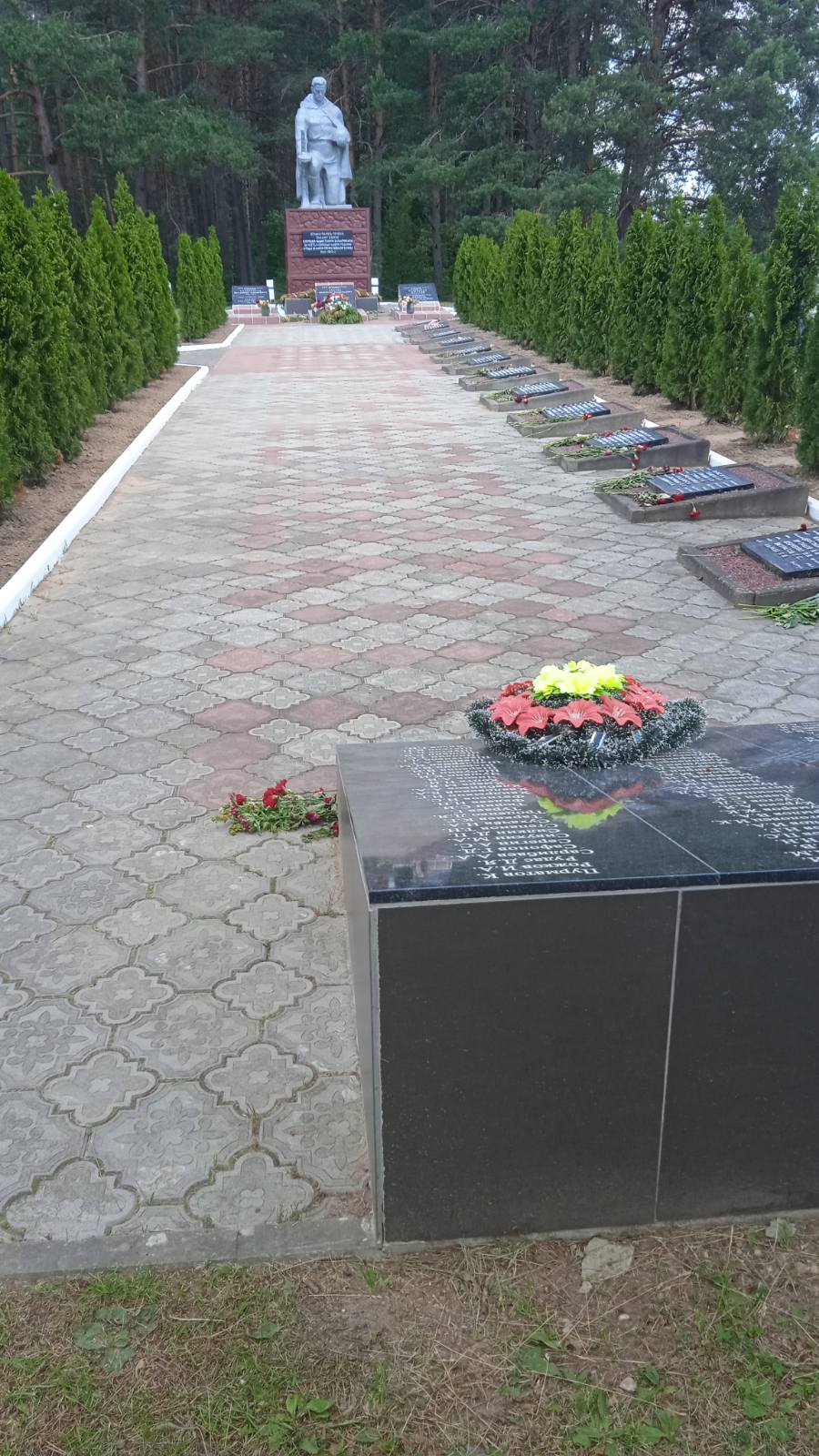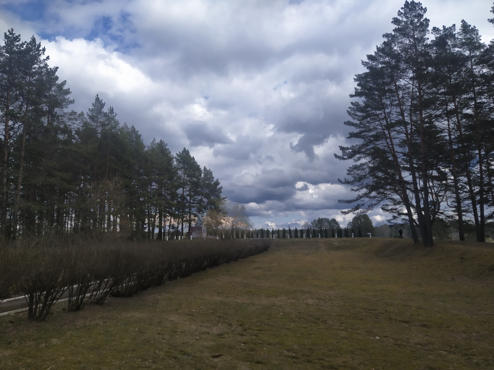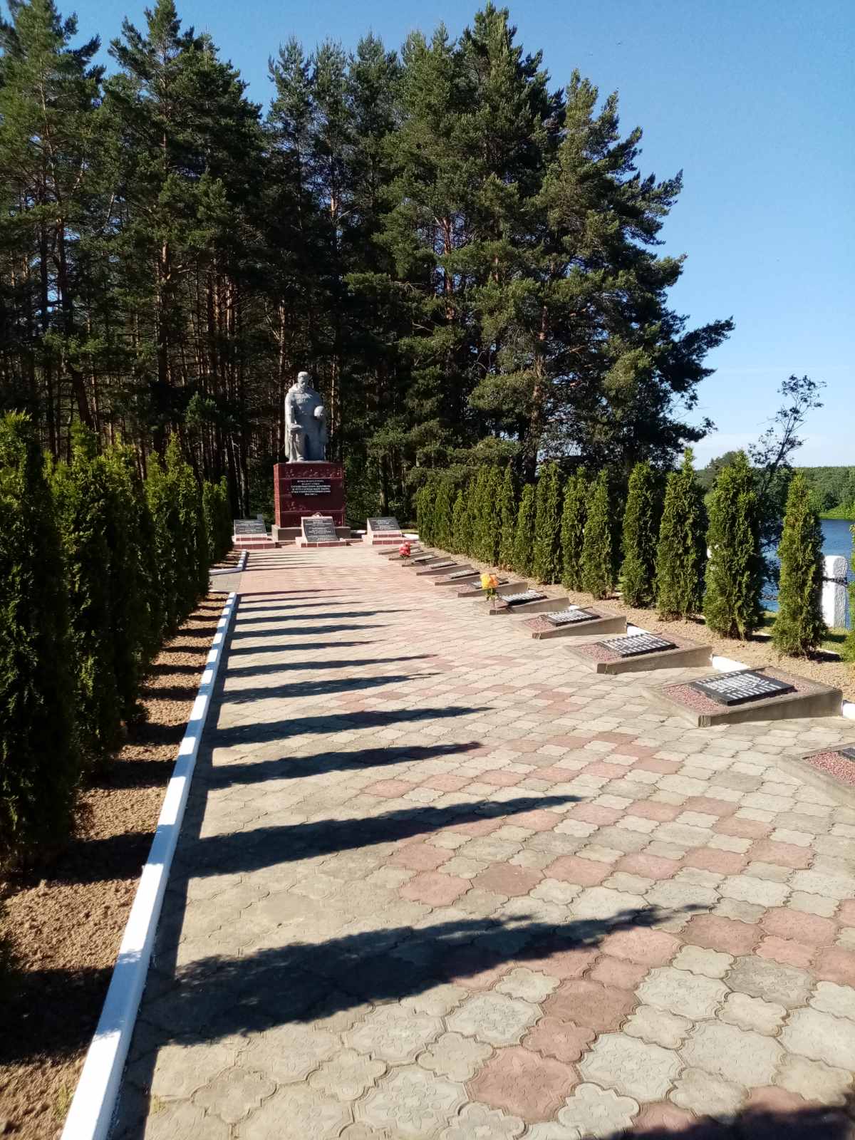 У 1959 г. на могілках пастаўлены помнік: скульптура воіна, які стаіць на калене з аўтаматам у правай руцэ і каскай у левай. На пастаменце размешчана мармуровая дошка з надпісам, на земляным вале размешчаны пліты з прозвішчамі загінулых.