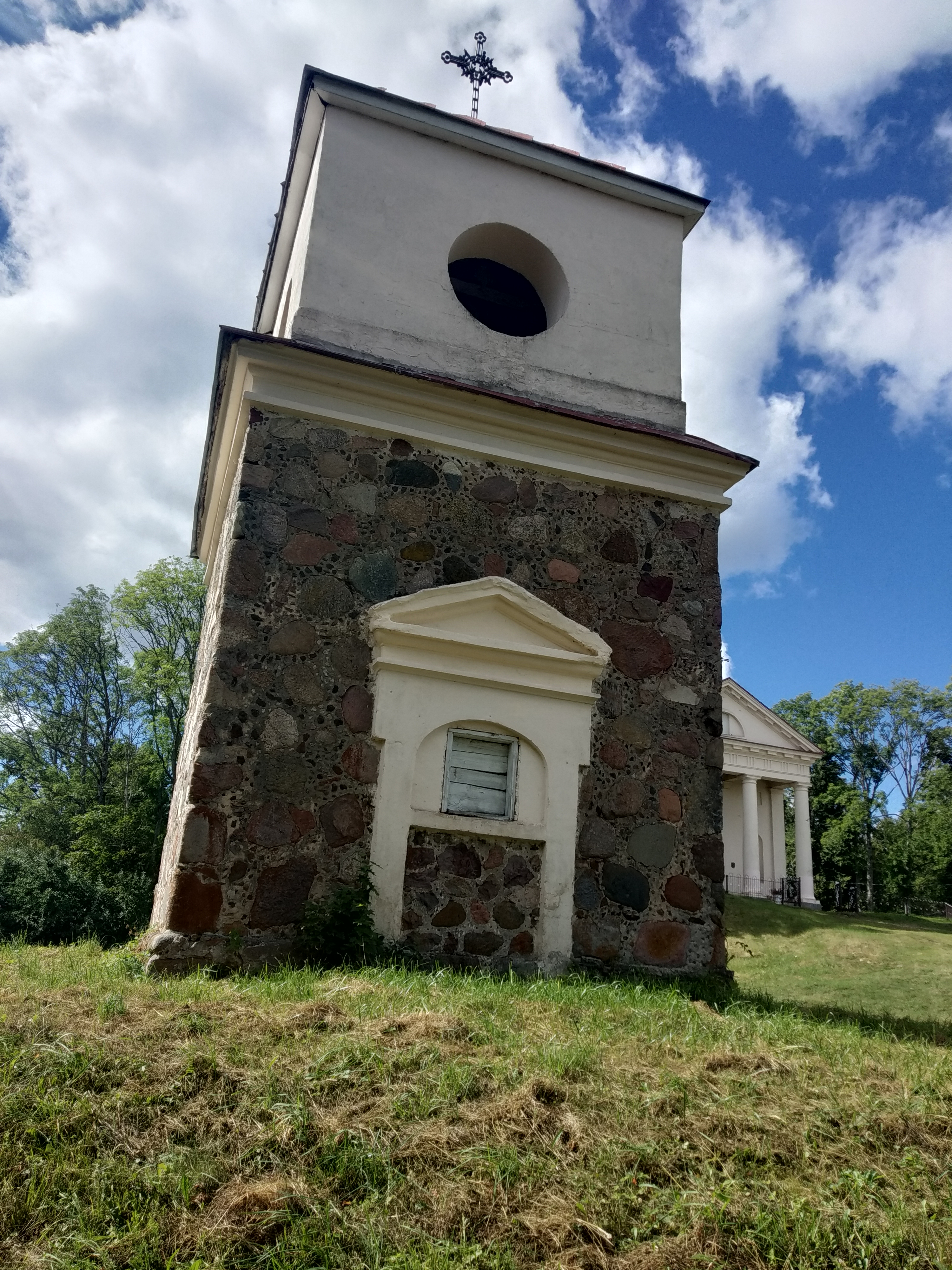 Прадстаўляе сабой двух'яруснае чацверыковае збудаванне. Накрыта шатровым дахам, увенчаным крыжам. Ніжні ярус вымураваны з апрацаваных палявых камянёў з украпінамі колатых чорных каменьчыкаў (так званая "разынкавая муроўка"). На заходнім фасадзе размешчаны арачны дзвярны праём, аформлены парталам з трохвугольным франтонам. Ніжні ярус званіцы аддзелены ад верхняга прафіляваным патынкаваным карнізам, накрытым зверху бляхай. Другі ярус вежы-званіцы змураваны з цэглы і патынкаваны.
