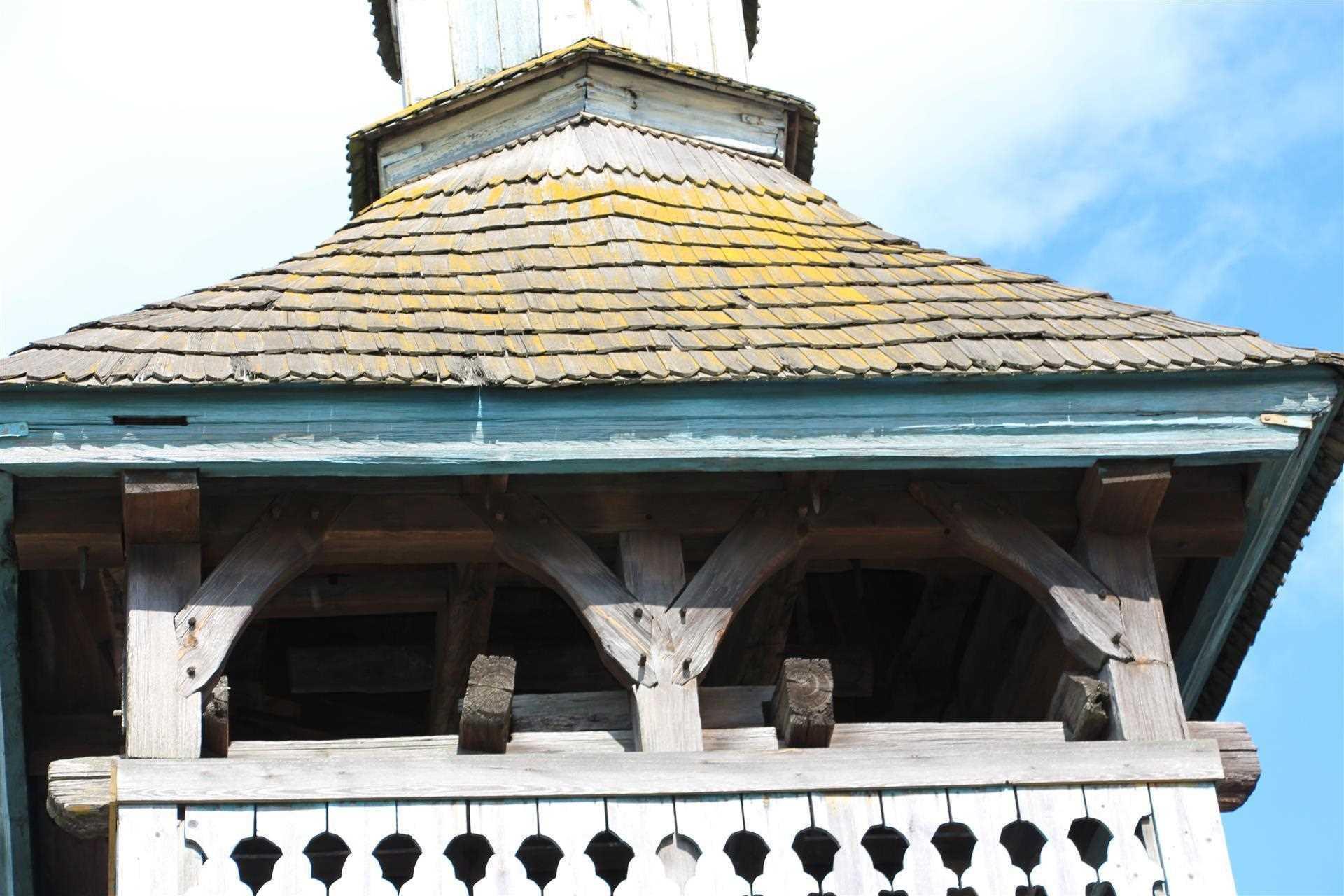 Уяўляе сабой цэнтрычнае квадратнае ў плане двух'яруснае збудаванне. Ніжні ярус зрублены з брусоў у лапу і аддзелены ад верхняга шырокім гонтавым адлівам. Верхні ярус каркасны, складаецца з 8 стоек, аб'яднаных разнымі крывалінейнымі падкосамі, якія ствараюць своеасаблівую аркаду, паміж імі разная дашчаная агароджа. Увянчана званіца шатровым верхам з гранёным барабанам. Цікава тым, што з'яўляецца пераходным тыпам ад двух'яруснай да трох'яруснай.